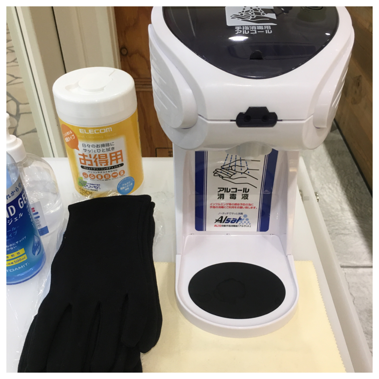 2.出入り口などに、お客さま用アルコール系消毒液・手袋の設置