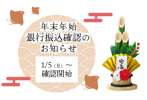 なお、年末年始期間中に【銀行振込】をご選択のうえご注文いただいた商品につきましては、銀行振込のご入金確認を1月5日(月)より順次開始いたします。