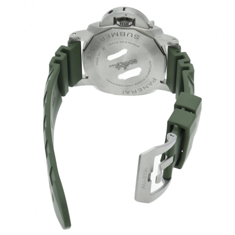 サテンスティール製ケースに、逆回転防止ベゼルを備えた構造は、ダイバーズウォッチとしての信頼性を確保しつつ、パネライらしい力強い外観を演出します。