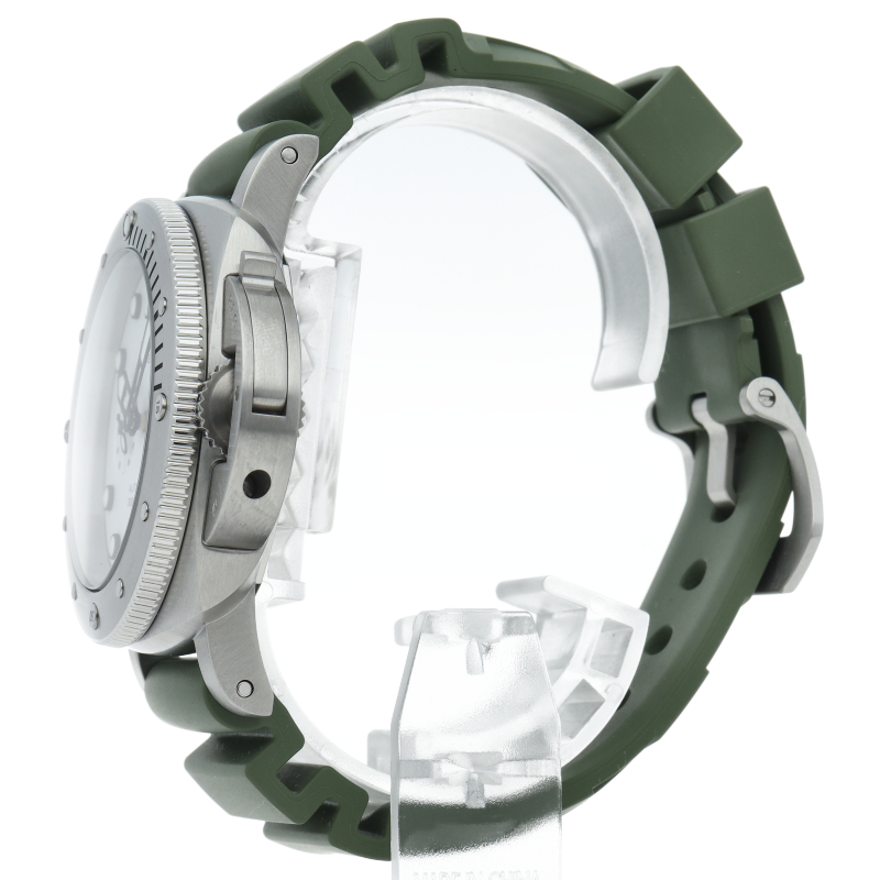 サテンスティール製ケースに、逆回転防止ベゼルを備えた構造は、ダイバーズウォッチとしての信頼性を確保しつつ、パネライらしい力強い外観を演出します。