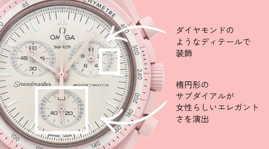 サブダイヤルの縁(ふち)に施されたダイヤのようなディテールが、楕円形のサブダイアルに女性らしい優雅さを添えています。