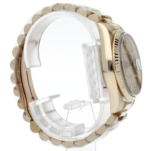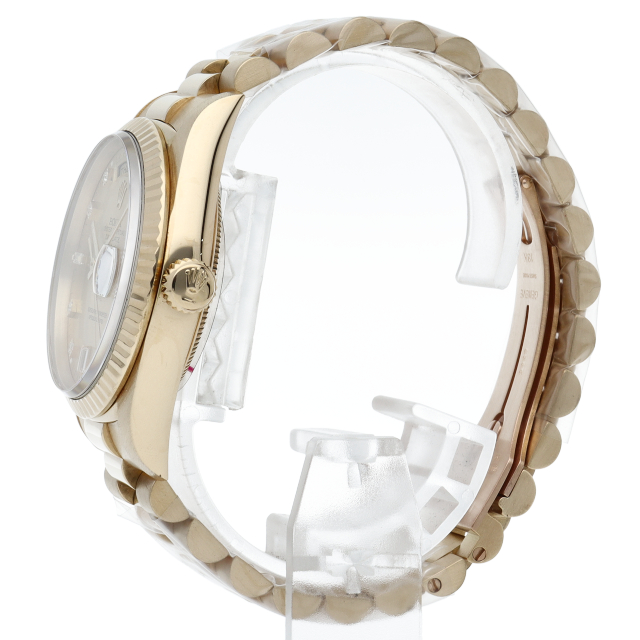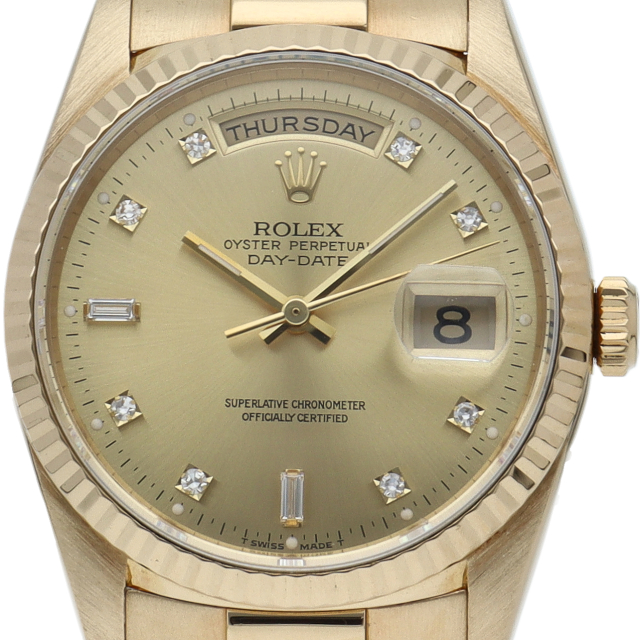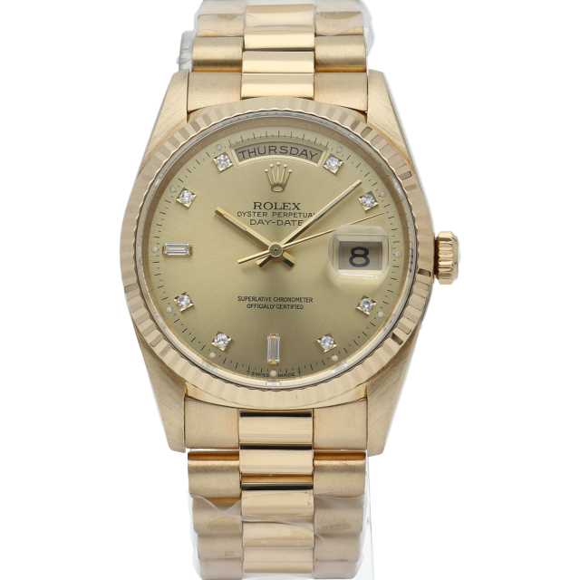 ロレックスのドレスウォッチの最高峰「デイデイト」。イエローゴールドを贅沢に使用した高級感溢れるステータスウォッチです。文字盤には10Pダイヤ付。