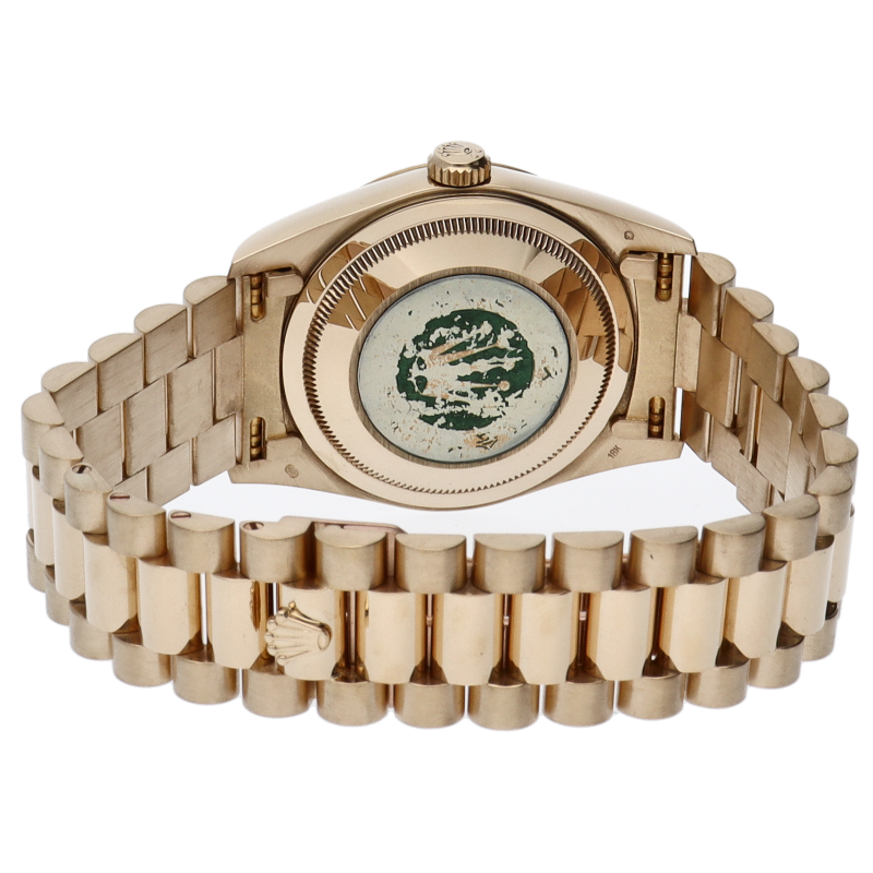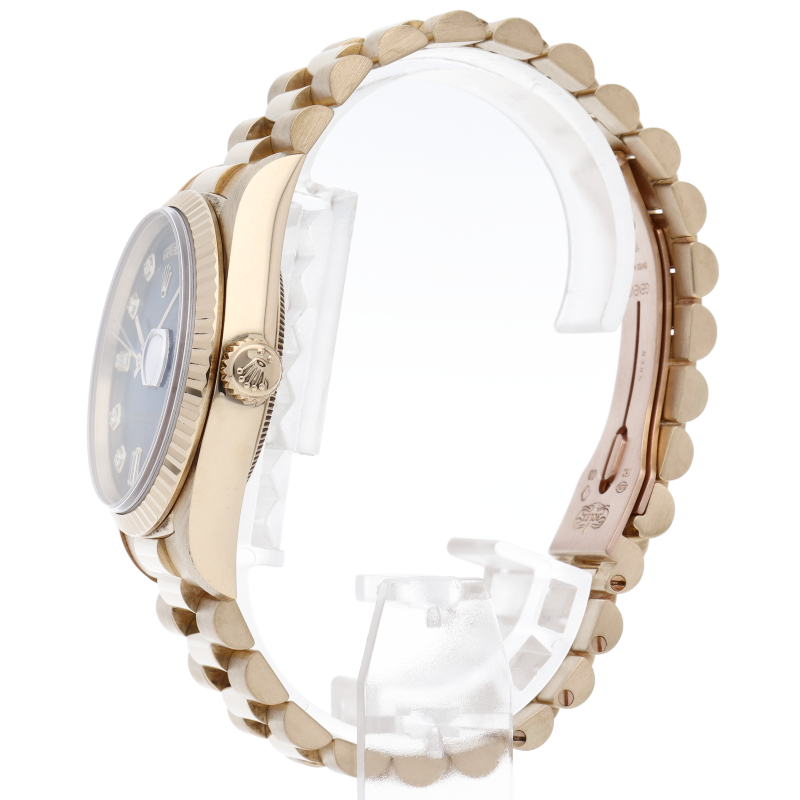 ロレックスのドレスウォッチの最高峰「デイデイト」。イエローゴールドを贅沢に使用した高級感溢れるステータスウォッチです。文字盤には10Pダイヤ付。