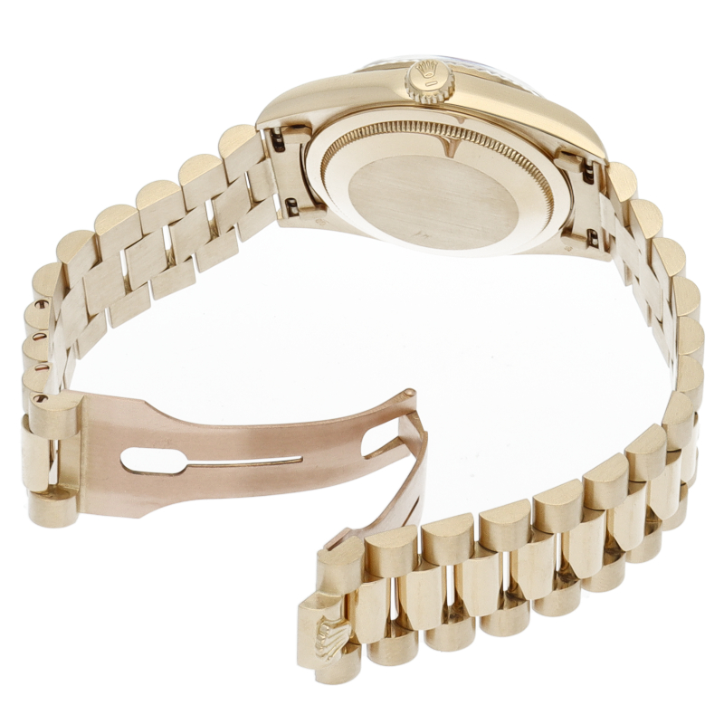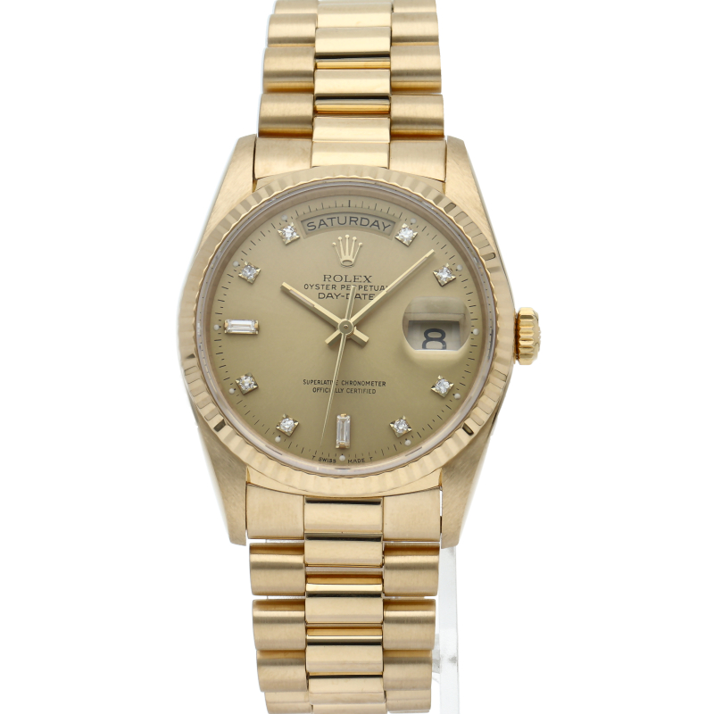 ロレックスのドレスウォッチの最高峰「デイデイト」。イエローゴールドを贅沢に使用した高級感溢れるステータスウォッチです。文字盤には10Pダイヤ付。