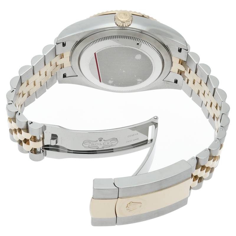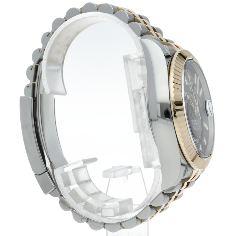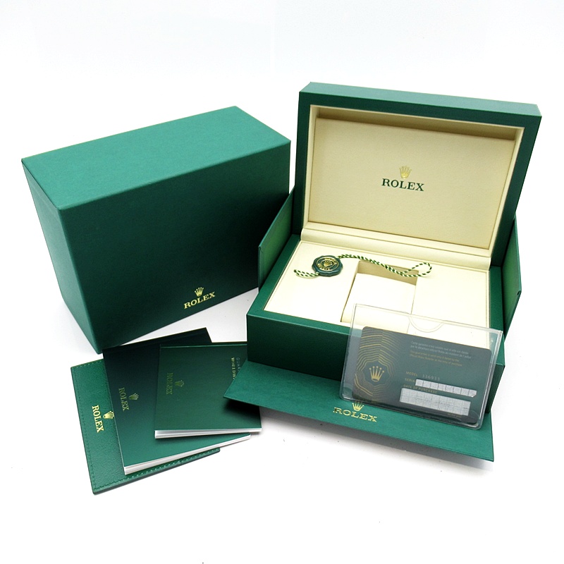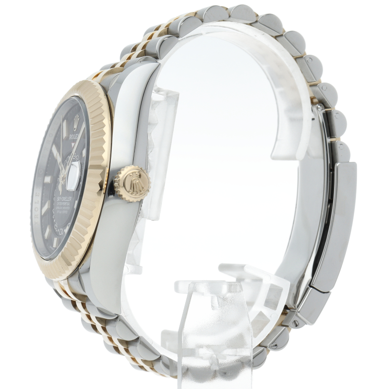 ジュビリーブレスを備えた2023年発表の「スカイドゥエラー」。ムーブメントは完全自社製の“Cal.9002”を搭載。文字盤中央で目を引くGMTディスク。こちらはGMTマスターとは異なりディスクが回転することで赤い逆三角形のマーカーから第二時間帯(ホームタイム)を読み取ります。完全自社製ムーブメント キャリバー「9002」搭載。