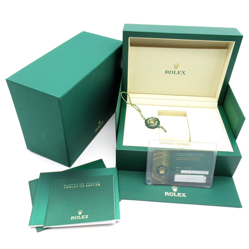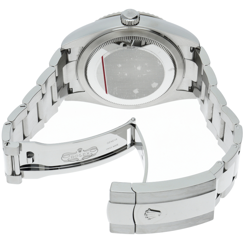 ジュビリーブレスを備えた2023年発表の「スカイドゥエラー」。ムーブメントは完全自社製の“Cal.9002”を搭載。文字盤中央で目を引くGMTディスク。こちらはGMTマスターとは異なりディスクが回転することで赤い逆三角形のマーカーから第二時間帯(ホームタイム)を読み取ります。完全自社製ムーブメント キャリバー「9002」搭載。