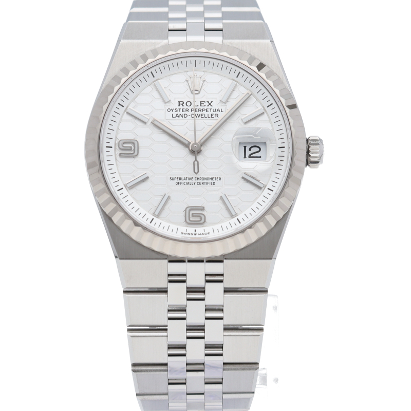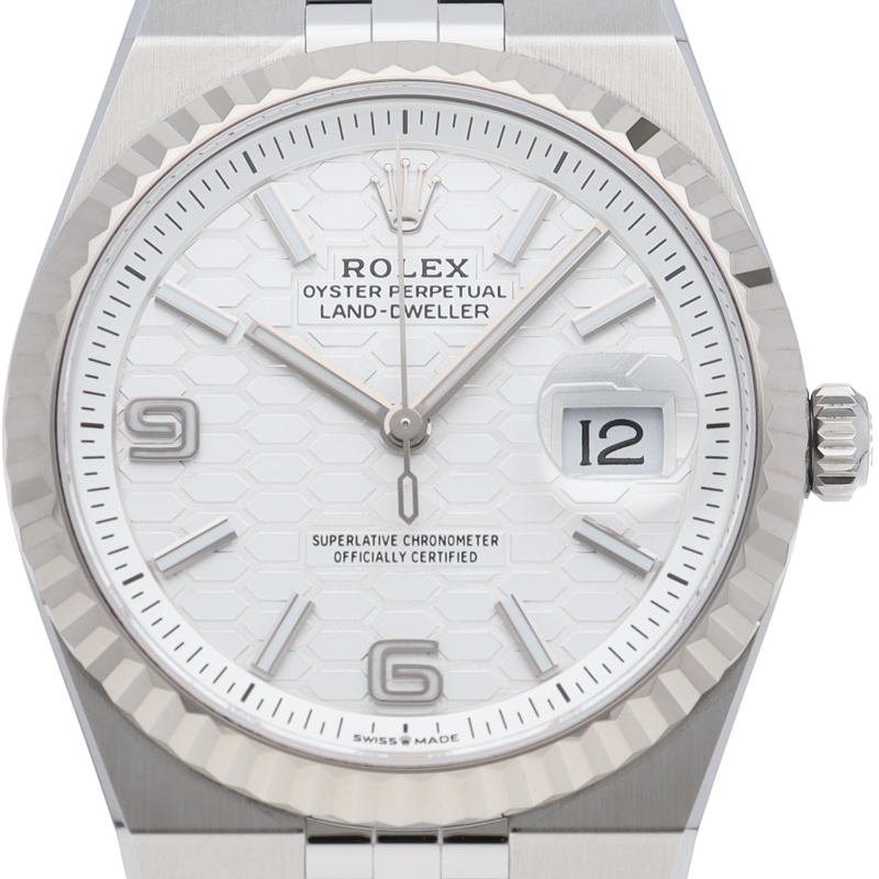 2025年発表の新モデル「ランドドゥエラー」。インテンスホワイトハニカムモチーフダイアルとフラットジュビリーブレスレットを備え、搭載しているキャリバー7135は66時間パワーリザーブ。この時計のために特別にデザインされたフラットジュビリーブレスレットは、オイスターケースとシームレスに溶け合うことでバランスの取れたハーモニーを奏で、ポリッシュ仕上げとテクニカルサテン仕上げが交互に施されています。