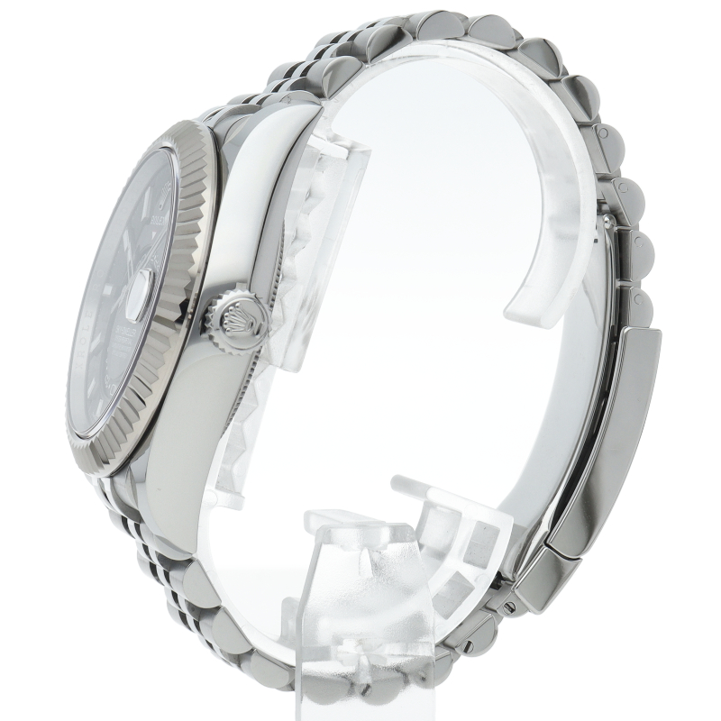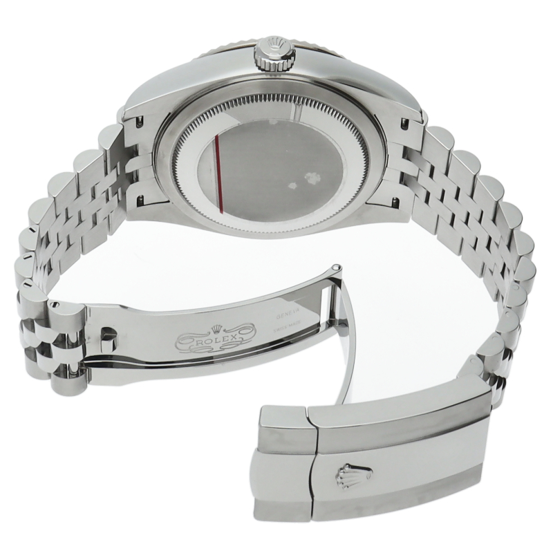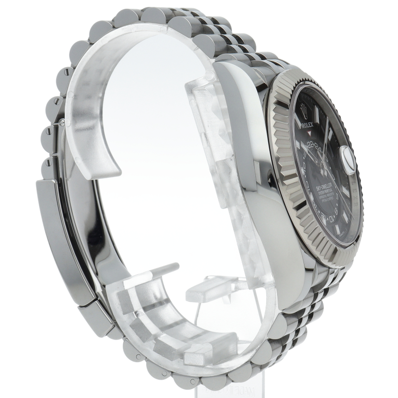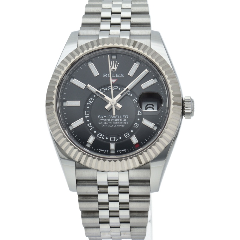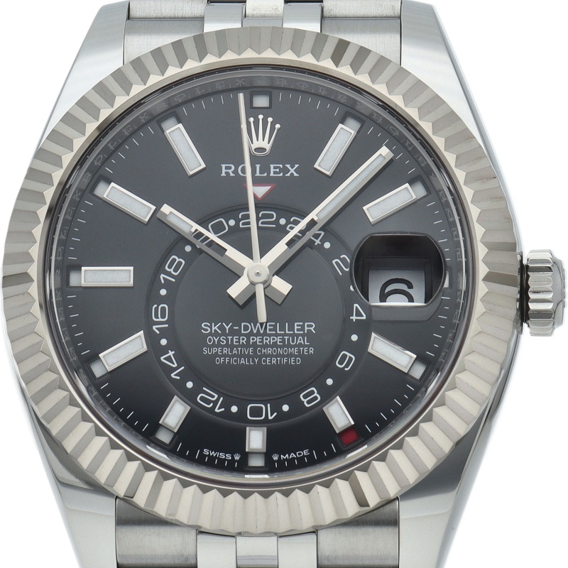 ジュビリーブレスを備えた2023年発表の「スカイドゥエラー」。ムーブメントは完全自社製の“Cal.9002”を搭載。文字盤中央で目を引くGMTディスク。こちらはGMTマスターとは異なりディスクが回転することで赤い逆三角形のマーカーから第二時間帯(ホームタイム)を読み取ります。