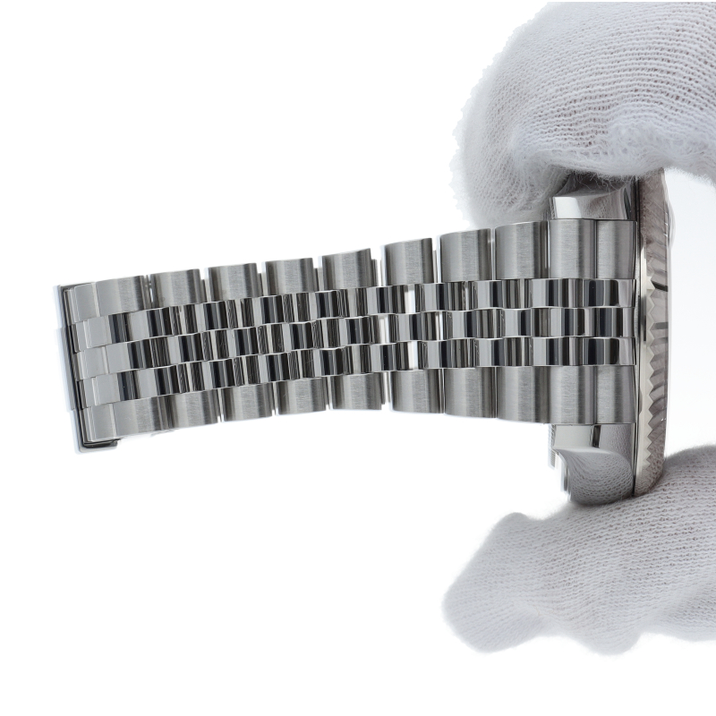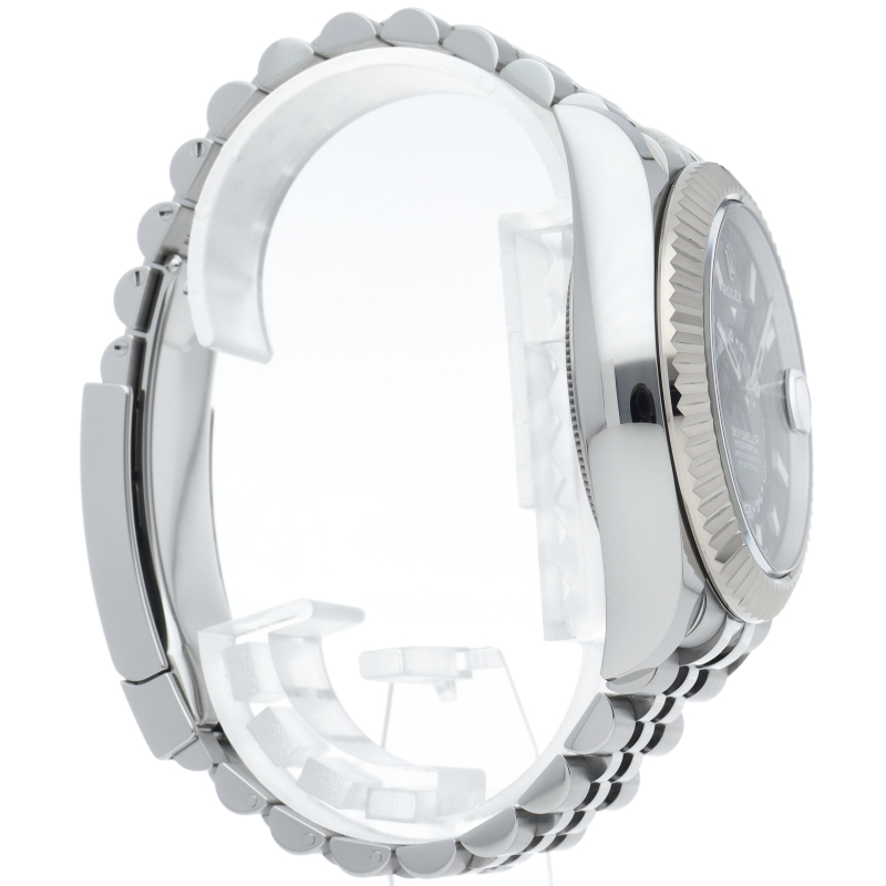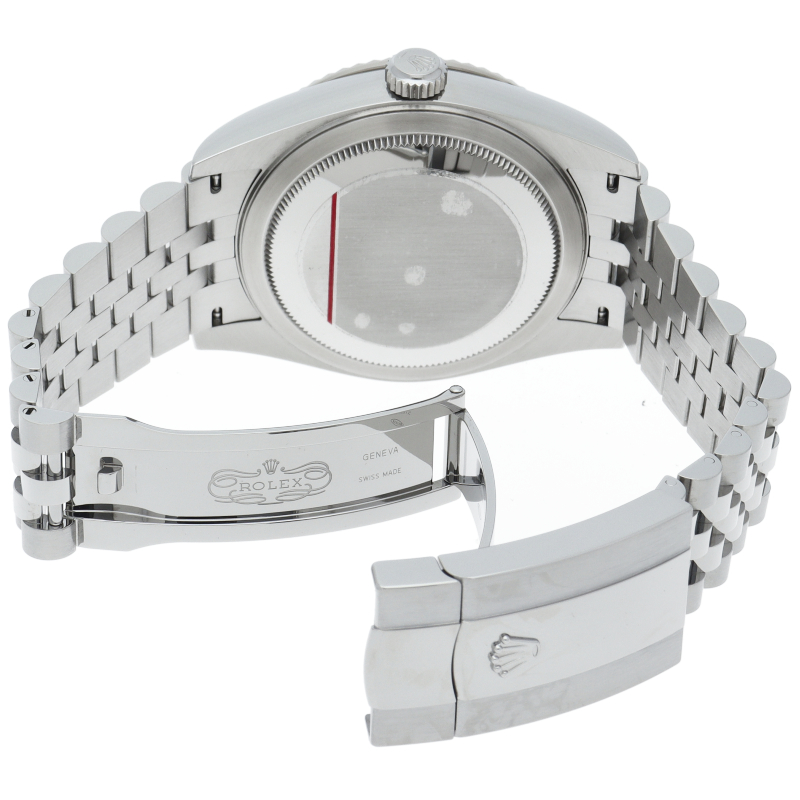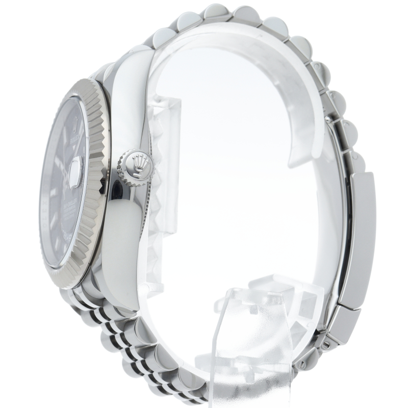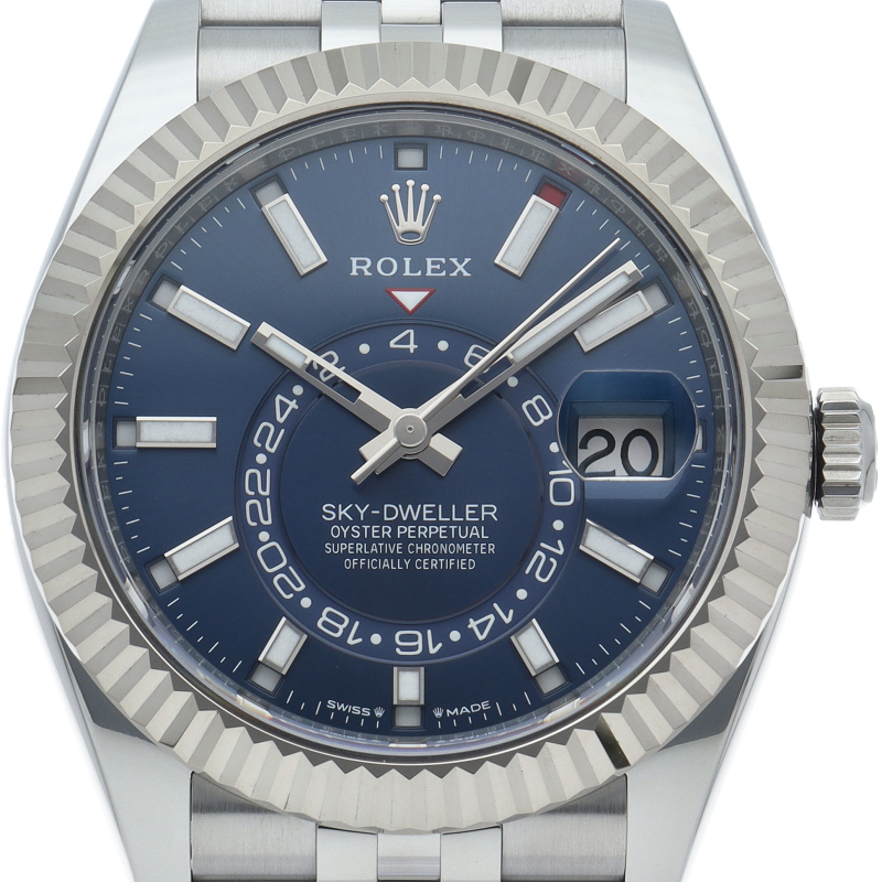 ジュビリーブレスを備えた2023年発表の「スカイドゥエラー」。ムーブメントは完全自社製の“Cal.9002”を搭載。文字盤中央で目を引くGMTディスク。こちらはGMTマスターとは異なりディスクが回転することで赤い逆三角形のマーカーから第二時間帯(ホームタイム)を読み取ります。