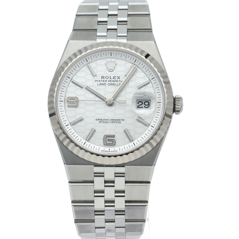 2025年発表の新モデル「ランドドゥエラー」。インテンスホワイトハニカムモチーフダイアルとフラットジュビリーブレスレットを備え、搭載しているキャリバー7135は66時間パワーリザーブ。この時計のために特別にデザインされたフラットジュビリーブレスレットは、オイスターケースとシームレスに溶け合うことでバランスの取れたハーモニーを奏で、ポリッシュ仕上げとテクニカルサテン仕上げが交互に施されています。