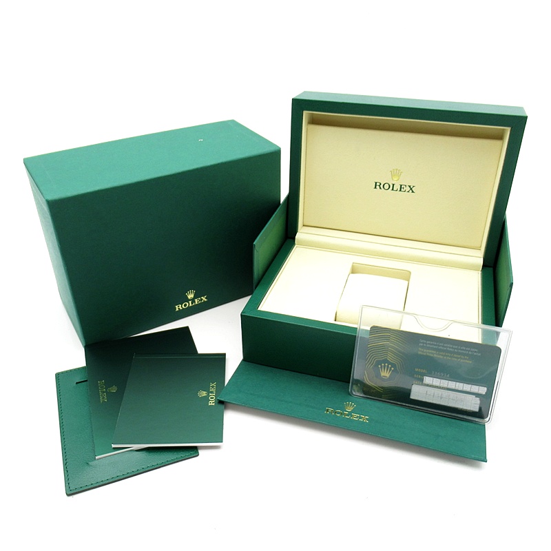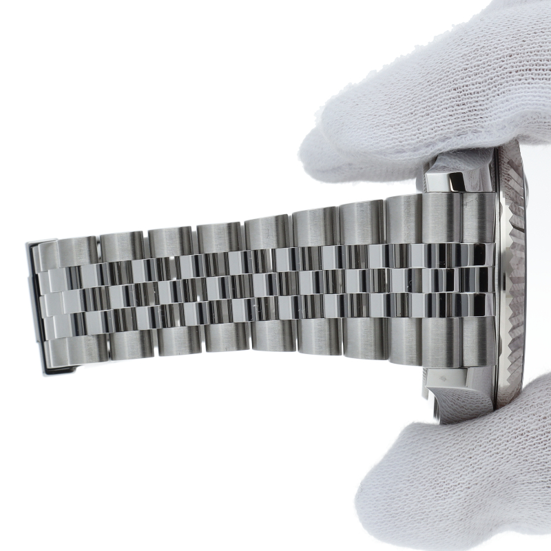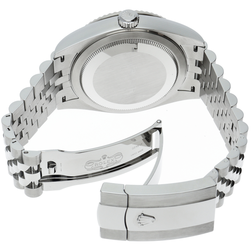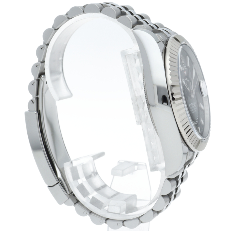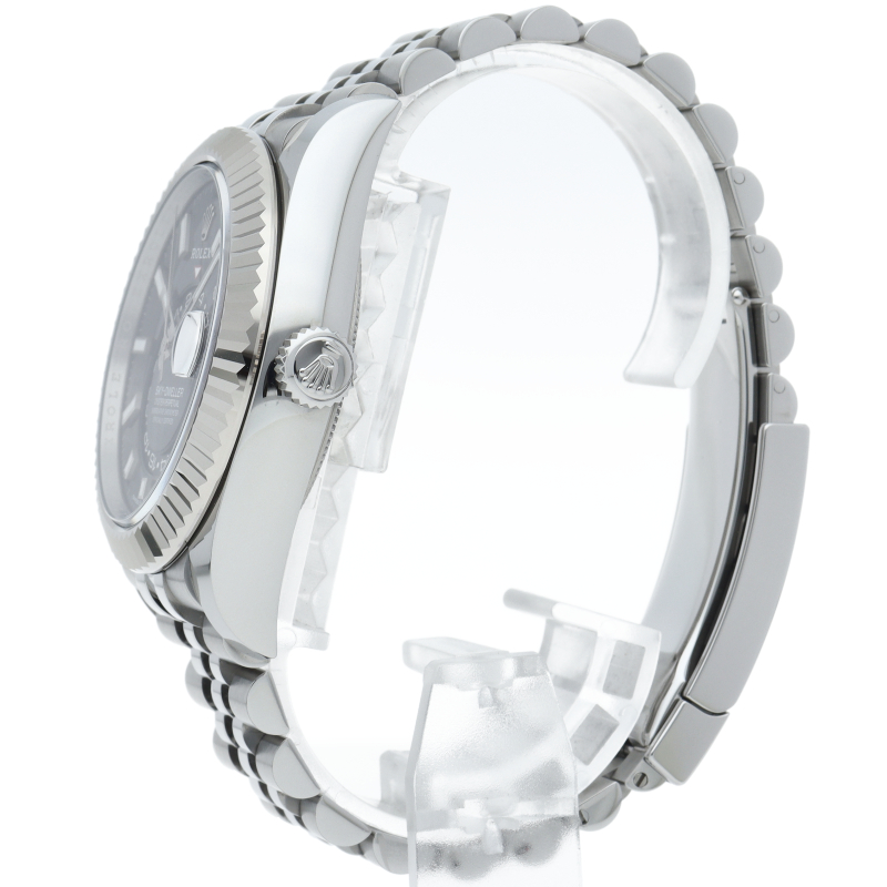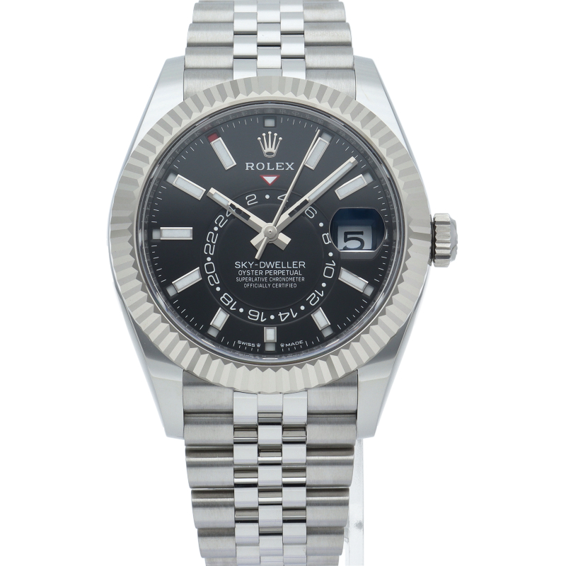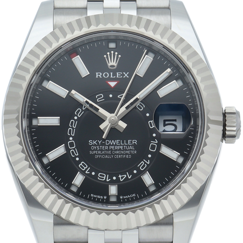 ジュビリーブレスを備えた2023年発表の「スカイドゥエラー」。ムーブメントは完全自社製の“Cal.9002”を搭載。文字盤中央で目を引くGMTディスク。こちらはGMTマスターとは異なりディスクが回転することで赤い逆三角形のマーカーから第二時間帯(ホームタイム)を読み取ります。