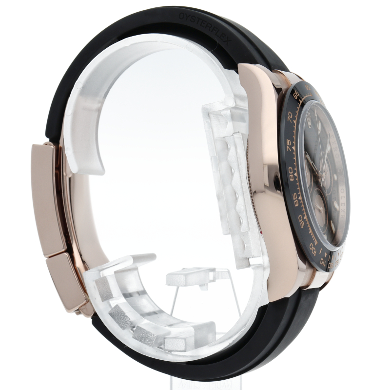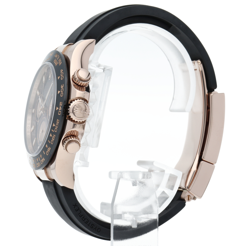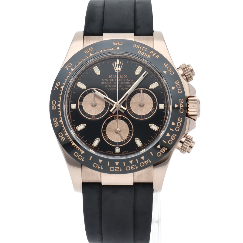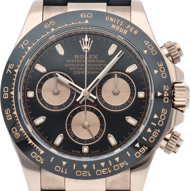 ロレックスの人気モデル「デイトナ」に、2011年に新たにラインナップされたエバーローズゴールドモデルに黒のセラミックベゼルを装着したタイプ。文字盤のブラックと相性抜群で上品な輝きがあります。