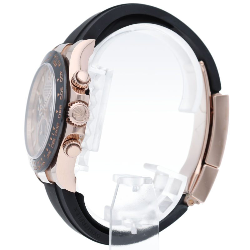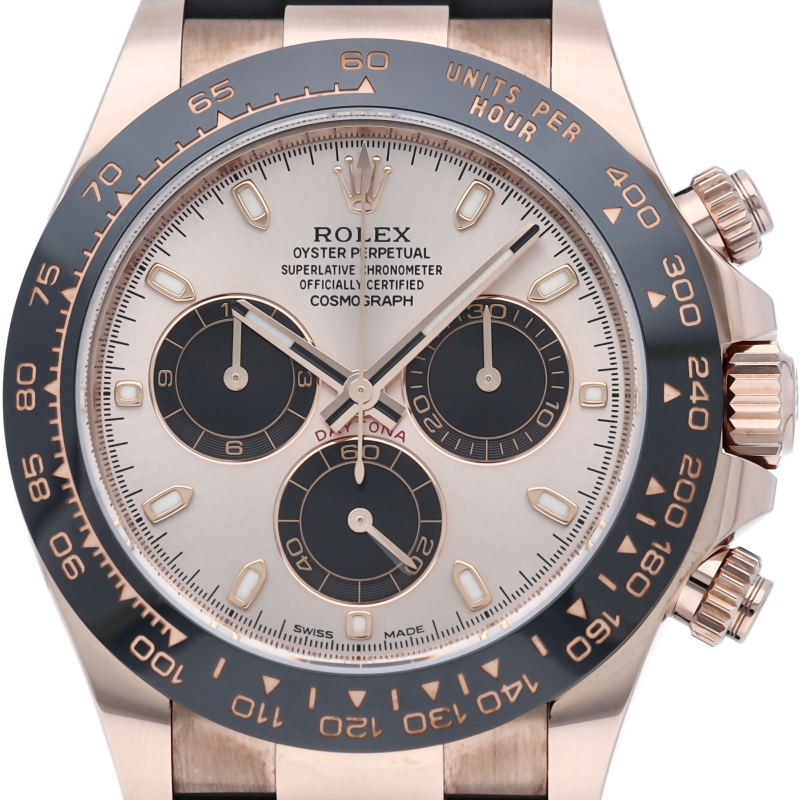 ロレックスの人気モデル「デイトナ」に、2011年に新たにラインナップされたエバーローズゴールドモデルに黒のセラミックベゼルを装着したタイプ。文字盤のブラックと相性抜群で上品な輝きがあります。