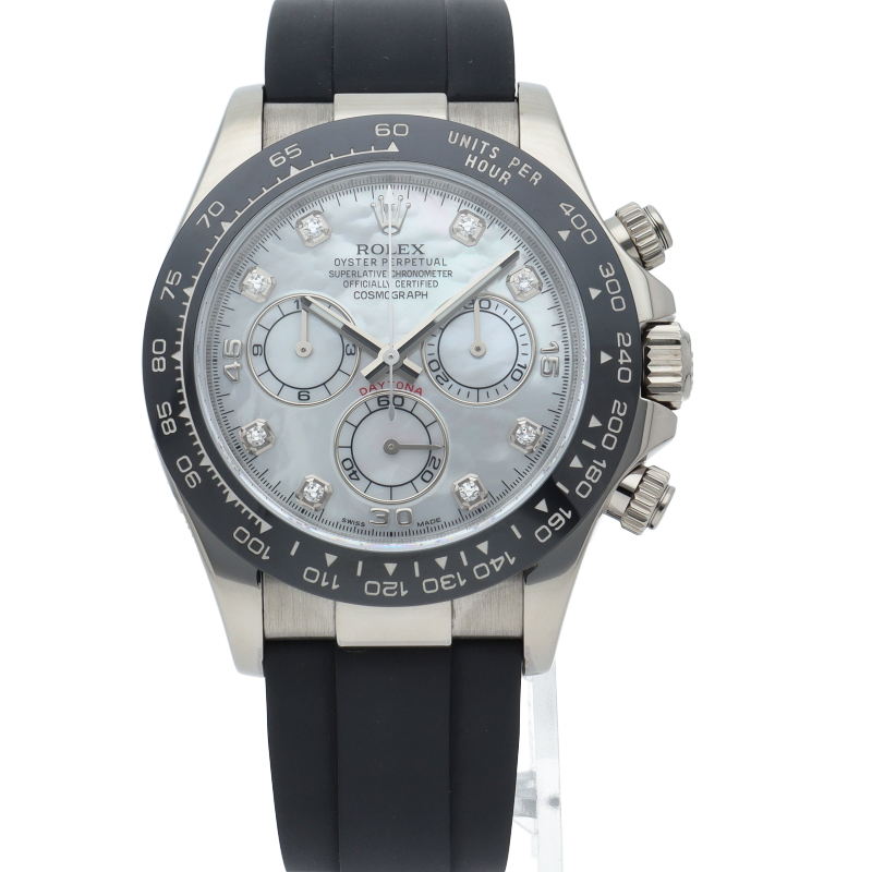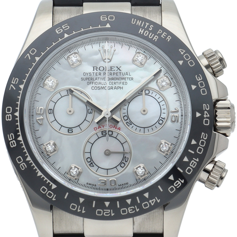 ロレックスのスポーツモデルの最高峰に君臨する「デイトナ」。自社開発クロノグラフムーブメント「Cal.4130」を搭載、機能性・デザイン性を兼ね備えた人気ウォッチ。セラクロムタキメーターベゼル仕様の人気モデルです。すでに生産が終了しているシェル文字盤・8Pダイヤ仕様。