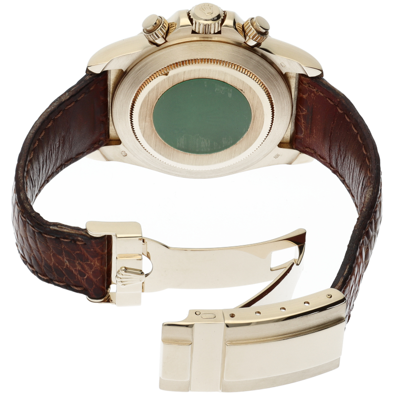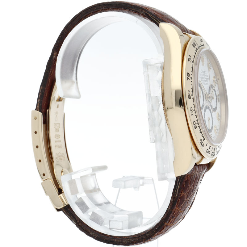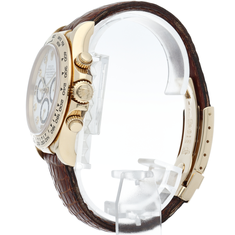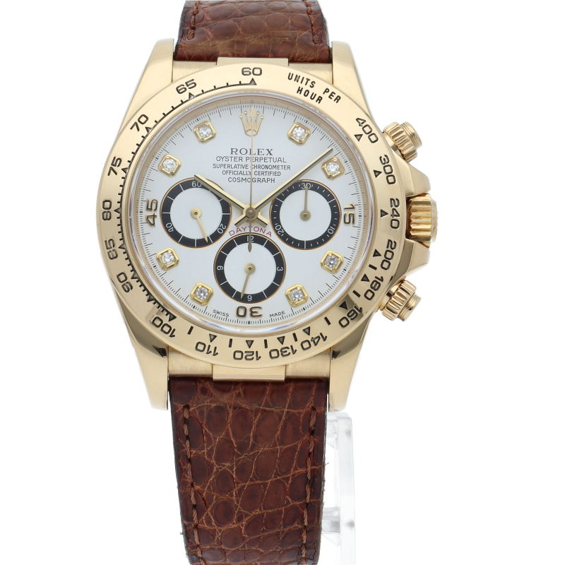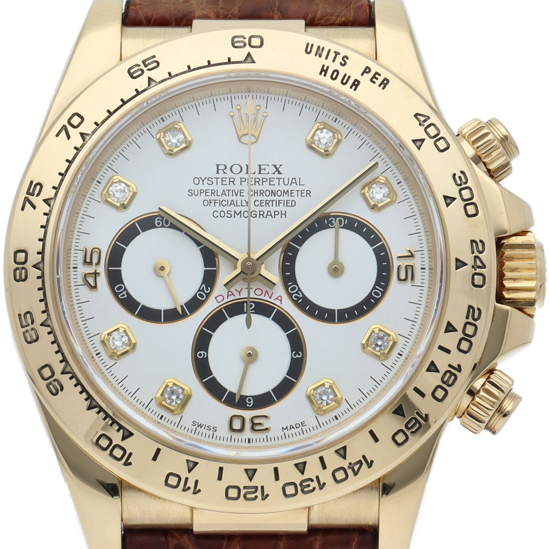 ゼニス社の世界最高峰ムーブメント「エルプリメロ」を搭載したロレックスのスポーツモデルの最上級モデル「デイトナ」。イエローゴールドケースに8Pダイヤが施されたワンランク上の1本。