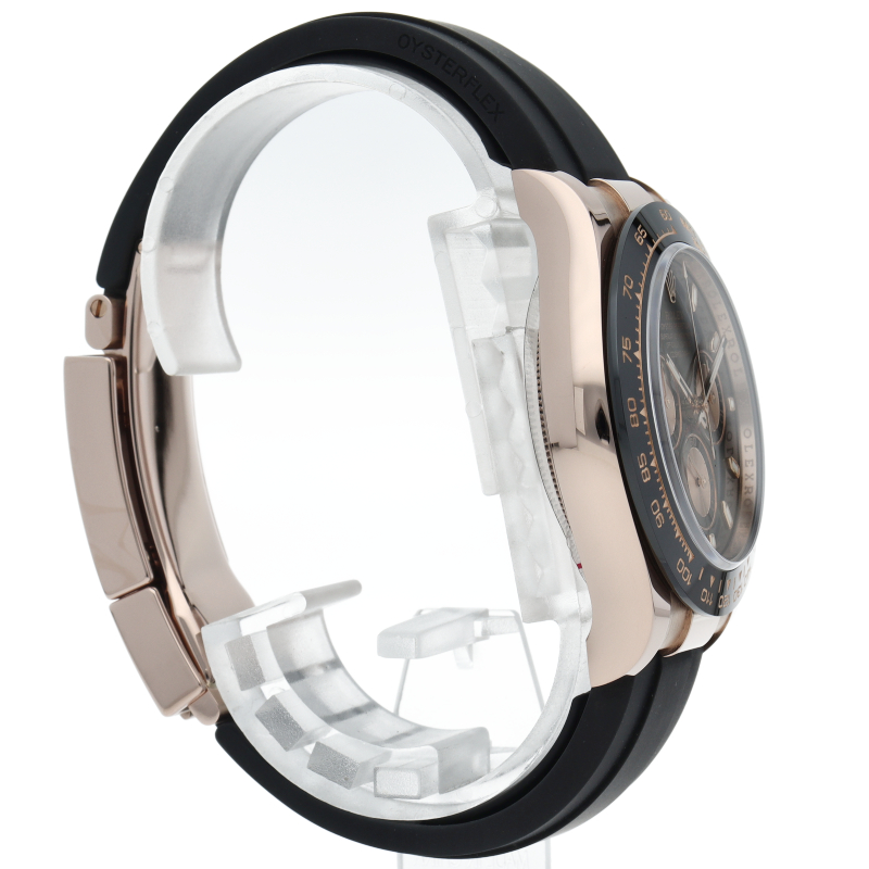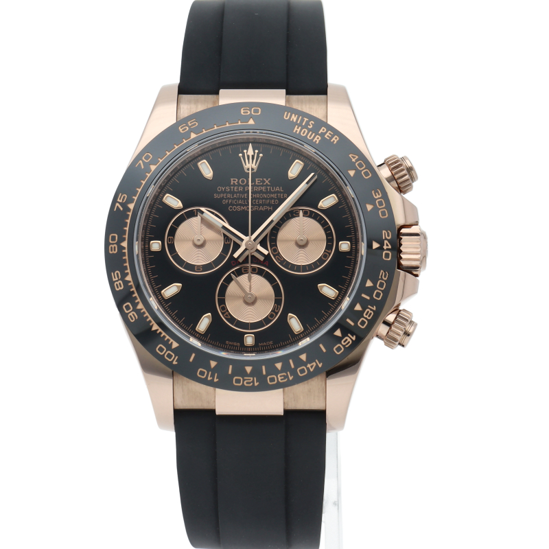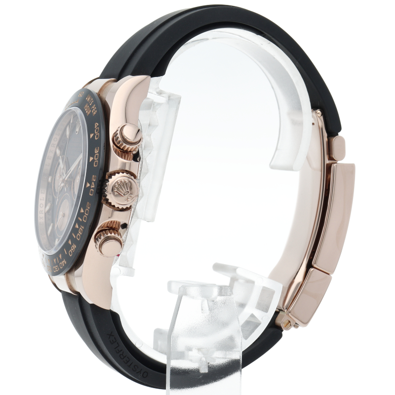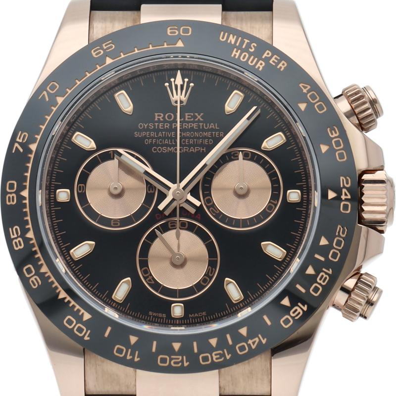 ロレックスの人気モデル「デイトナ」に、2011年に新たにラインナップされたエバーローズゴールドモデルに黒のセラミックベゼルを装着したタイプ。文字盤のブラックと相性抜群で上品な輝きがあります。