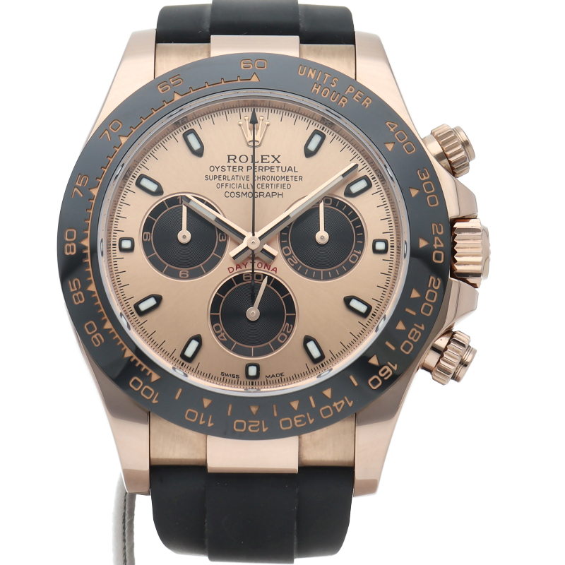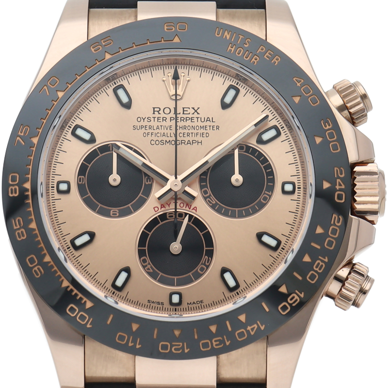 ロレックスの人気モデル「デイトナ」に、2011年に新たにラインナップされたエバーローズゴールドモデルに黒のセラミックベゼルを装着したタイプ。文字盤のピンクとブラックの相性抜群で上品な輝きがあります。