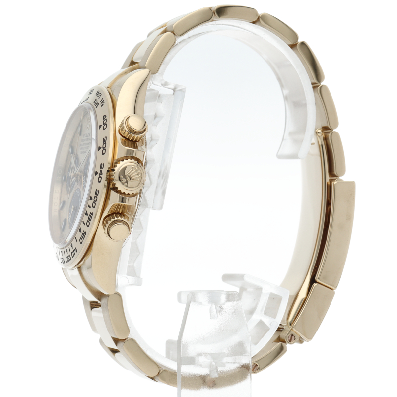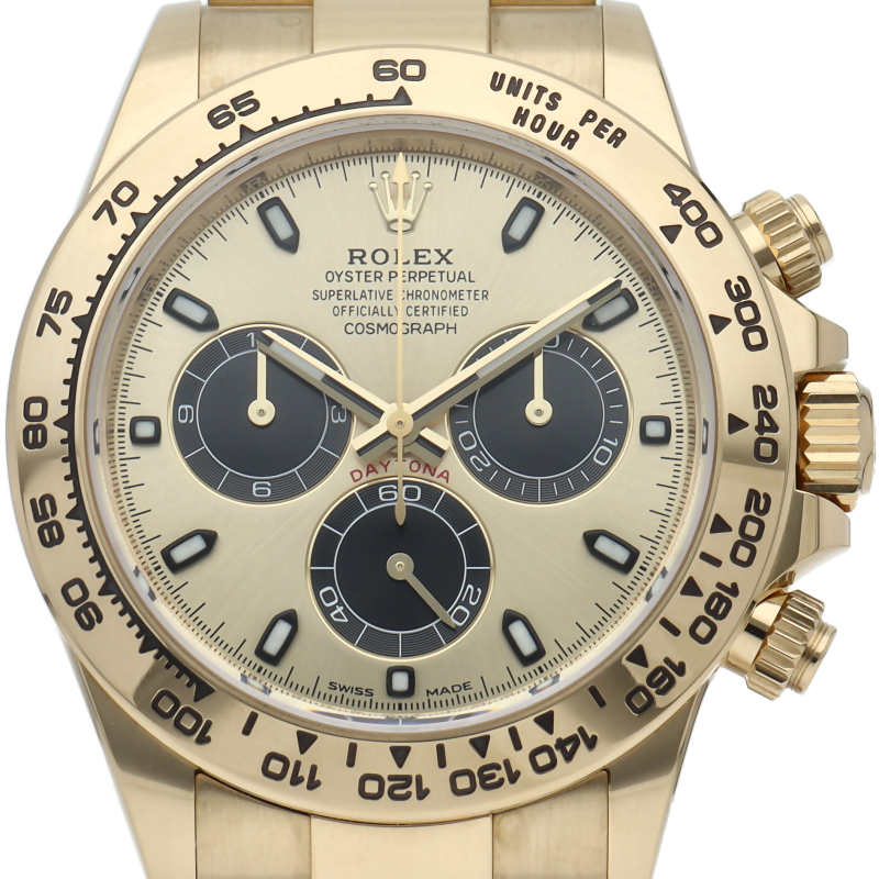 ロレックス「コスモグラフ デイトナ」(Ref.116508)。ケース、ブレス、ベゼルに至るまで18Kイエローゴールドを惜しみなく使用した至高の金無垢モデルです。ずっしりとした重量感と黄金の輝きが、圧倒的なステータス性を主張。スポーティさと極上のラグジュアリーが融合した、まさに「王様」の名にふさわしい最高級の一本です。