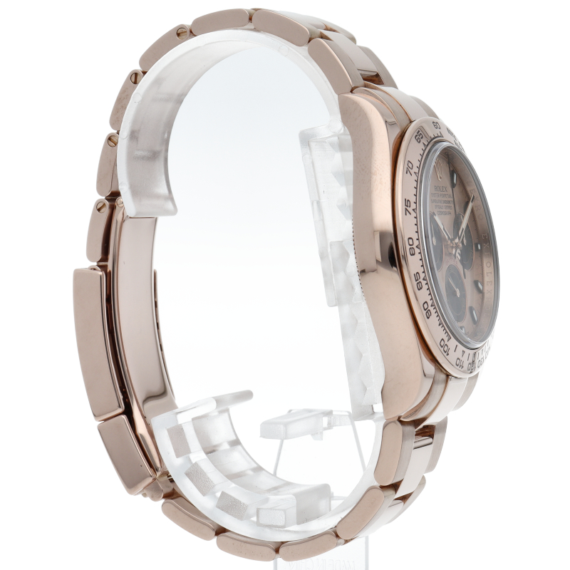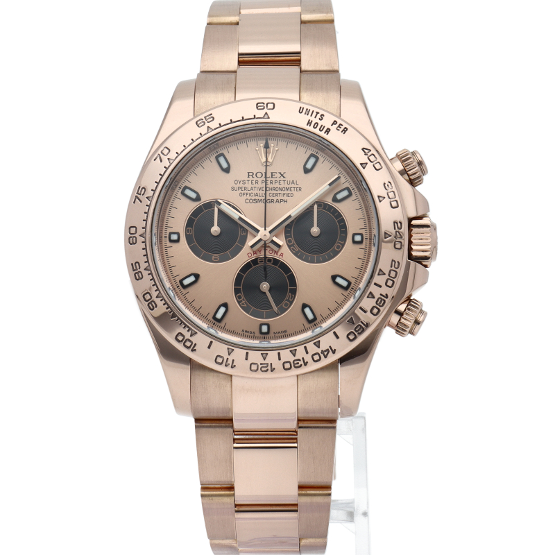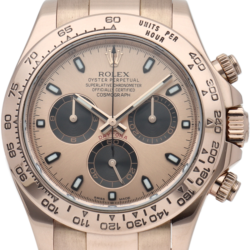 ロレックスのスポーツモデルの最高峰に君臨する「デイトナ」。自社開発クロノグラフムーブメント「Cal.4130」を搭載、機能性・デザイン性を兼ね備えた人気ウォッチ。エバーローズゴールドはロレックスが独自で開発した合金で、ラグジュアリーな雰囲気を演出。