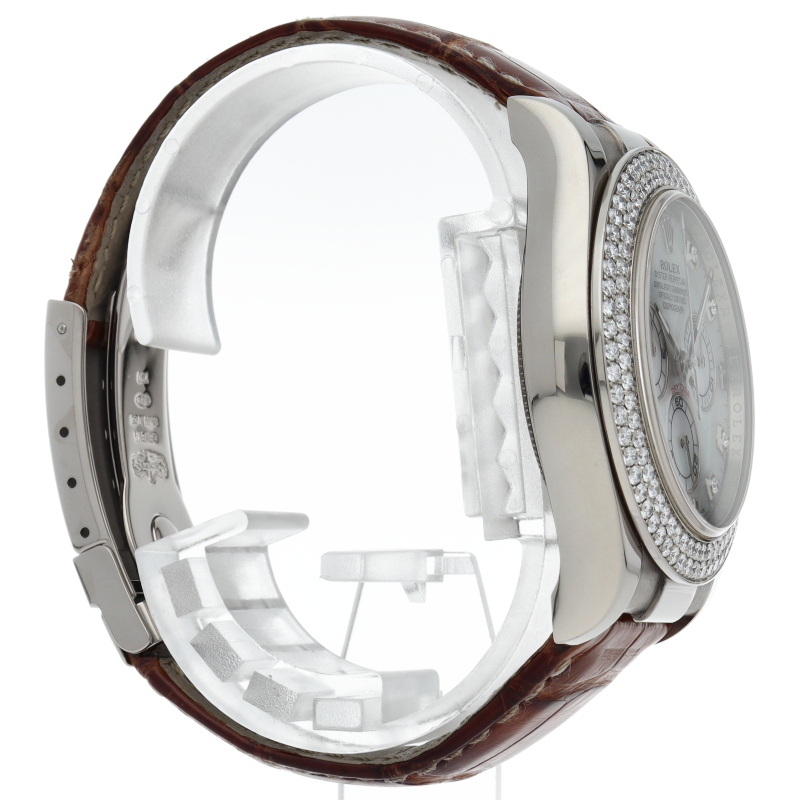ロレックスのスポーツモデルの最上級モデル「デイトナ」。ホワイトゴールドケースにシェル文字盤を配し、インデックスとベゼルにはダイヤを施したラグジュアリーな一本です。