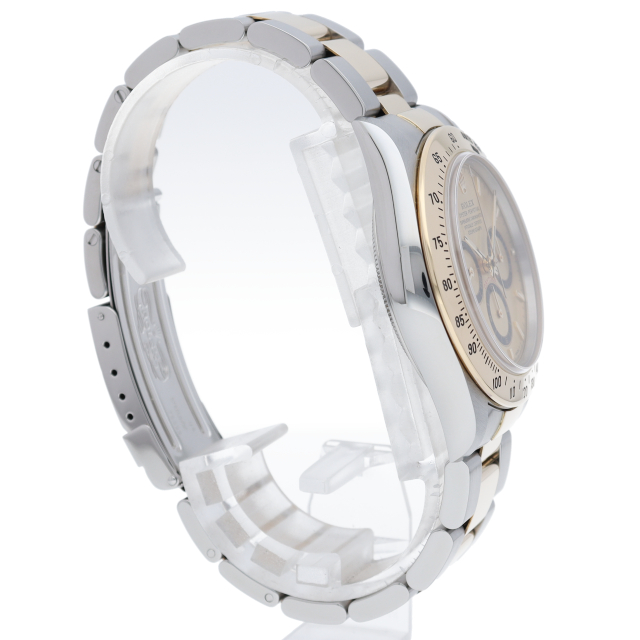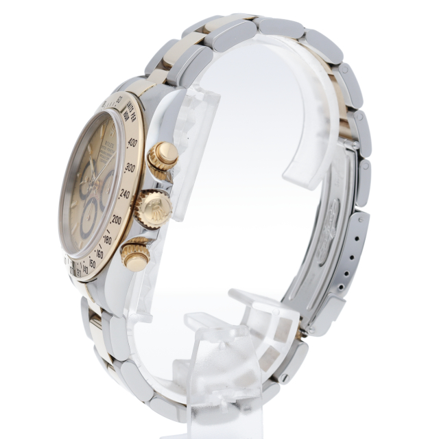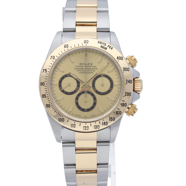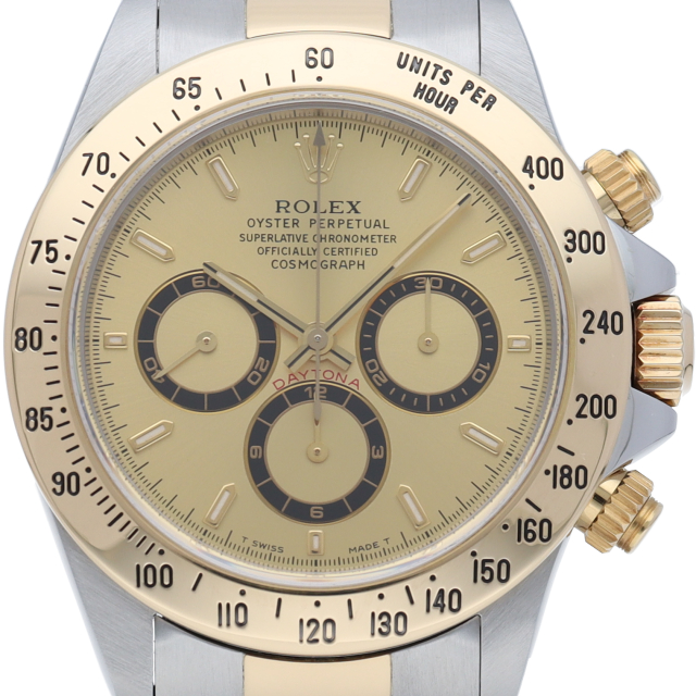 ゼニス社の世界最高峰ムーブメント「エルプリメロ」を搭載したロレックスのスポーツモデルの最上級モデル「デイトナ」。こちらはイエローゴールドとのコンビ仕様で高級感も増した1本。こちらは初期型のトリチウムにインダイヤルの6が逆になった希少な文字盤です。保証書も付属した資産価値も楽しみな1本です。