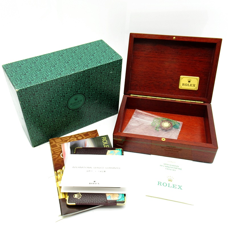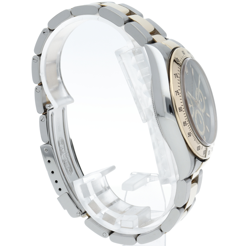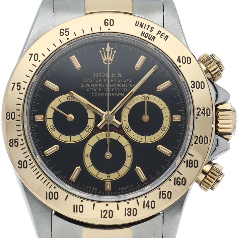 ゼニス社の世界最高峰ムーブメント「エルプリメロ」を搭載したロレックスのスポーツモデルの最上級モデル「デイトナ」。こちらはイエローゴールドとのコンビ仕様で高級感も増した1本。こちらは初期型のトリチウムにインダイヤルの6が逆になった希少な文字盤です。保証書も付属した資産価値も楽しみな1本です。
