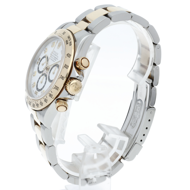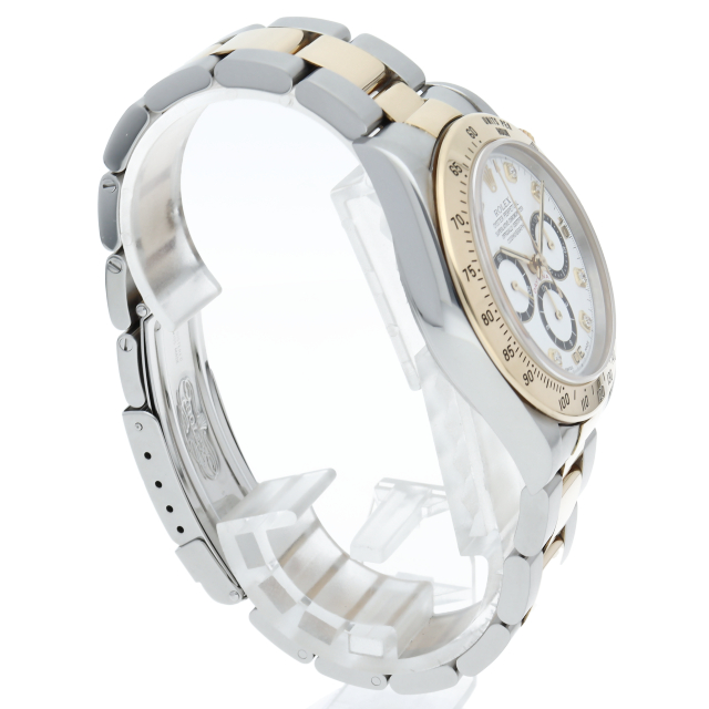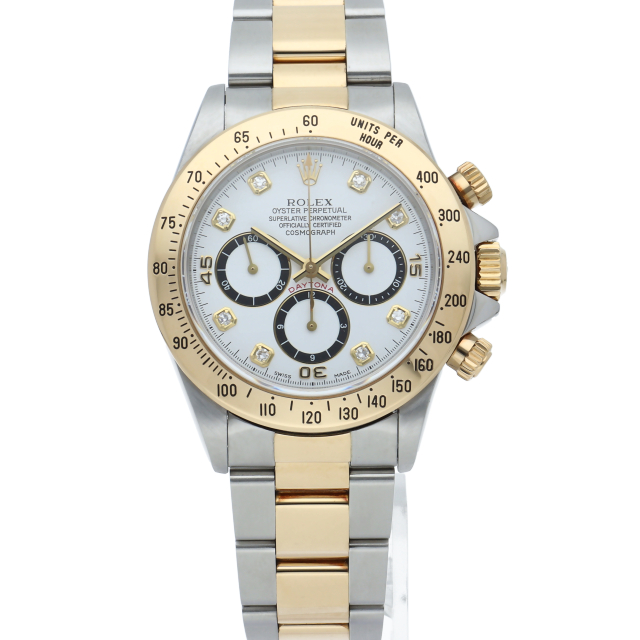 ゼニス社の世界最高峰ムーブメント「エルプリメロ」を搭載したロレックスのスポーツモデルの最上級モデル「デイトナ」。こちらはイエローゴールドとのコンビ仕様で文字盤にダイヤをあしらった高級感も増した1本。