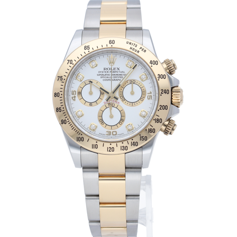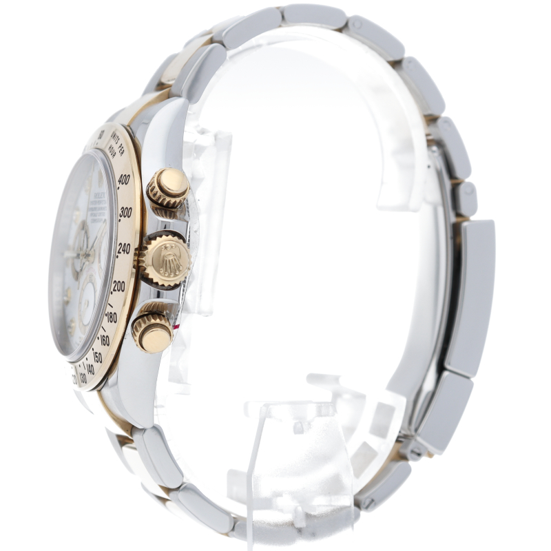ロレックスのスポーツモデルの最高峰に君臨する「デイトナ」。自社開発クロノグラフムーブメント「Cal.4130」を搭載、機能性・デザイン性を兼ね備えた人気ウォッチ。イエローゴールドとステンレスのコンビ仕様に8Pダイヤが施されております。