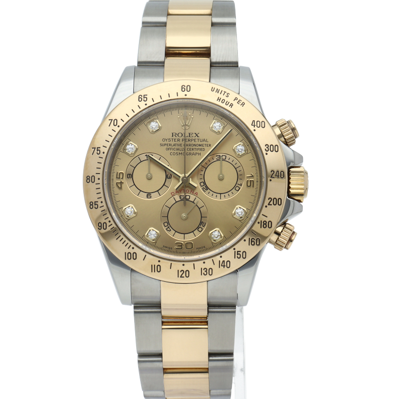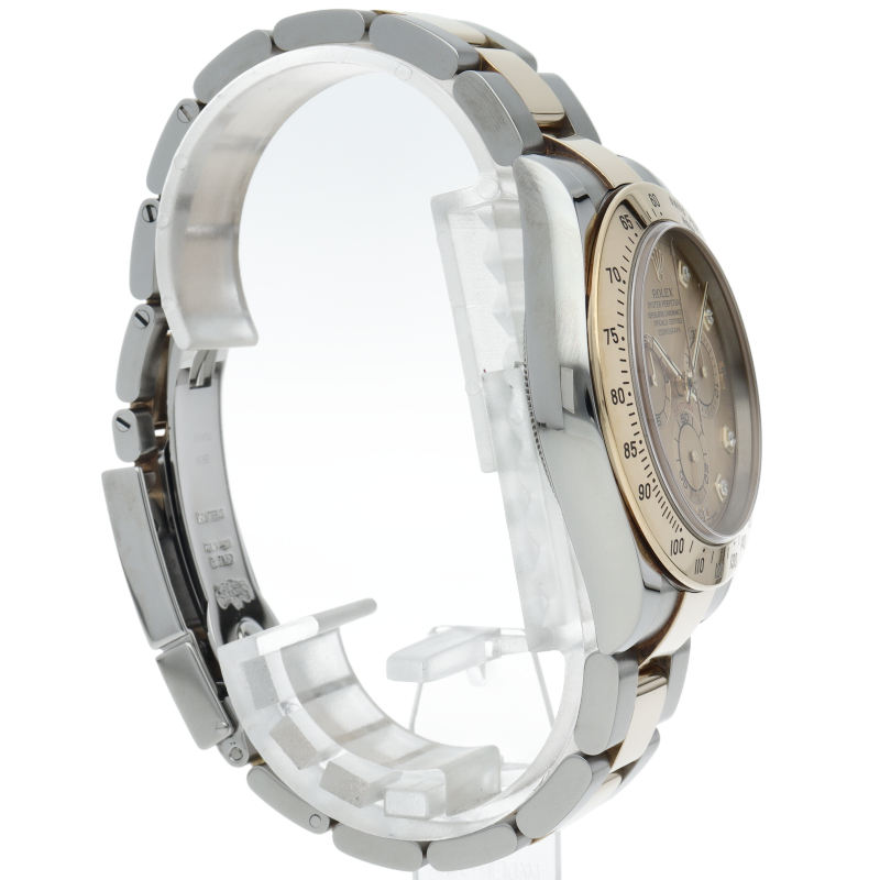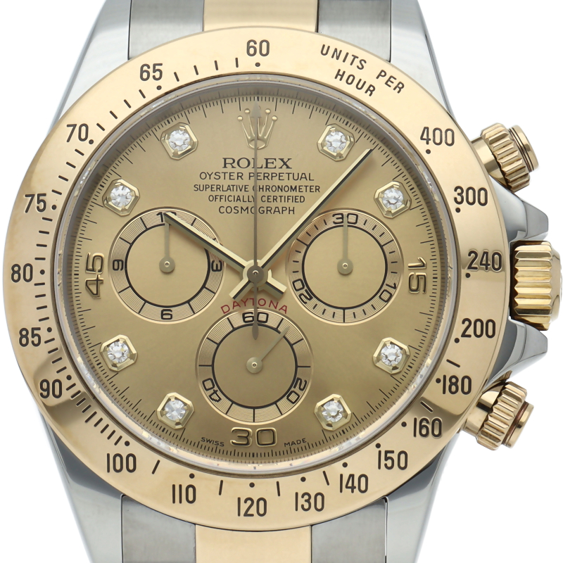 ロレックスのスポーツモデルの最高峰に君臨する「デイトナ」。自社開発クロノグラフムーブメント「Cal.4130」を搭載、機能性・デザイン性を兼ね備えた人気ウォッチ。イエローゴールドとステンレスのコンビ仕様に8Pダイヤが施されております。