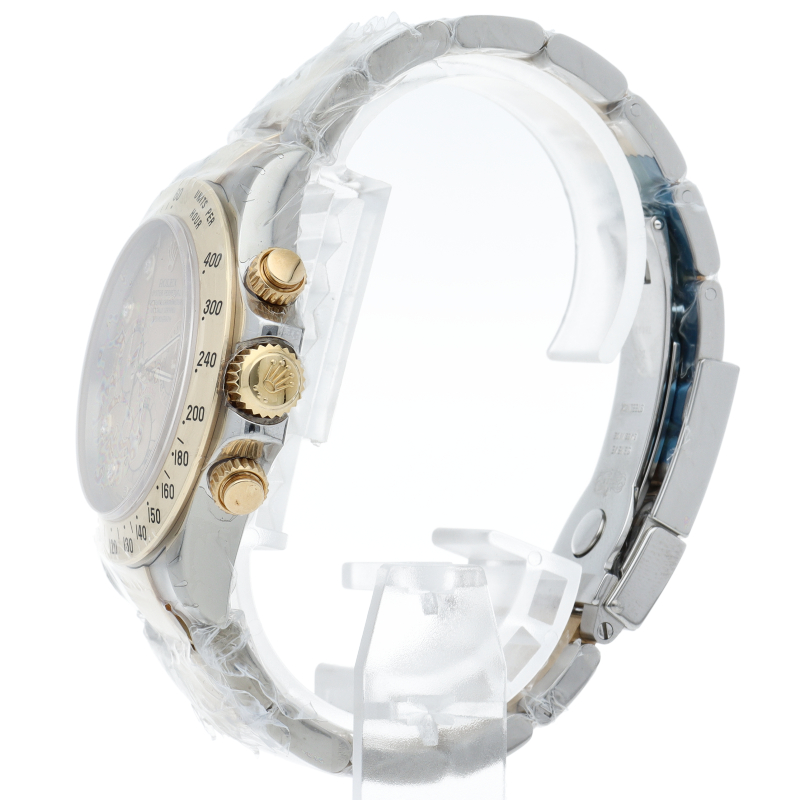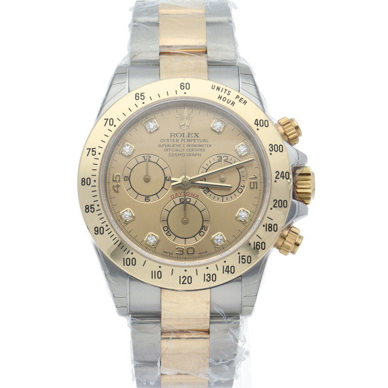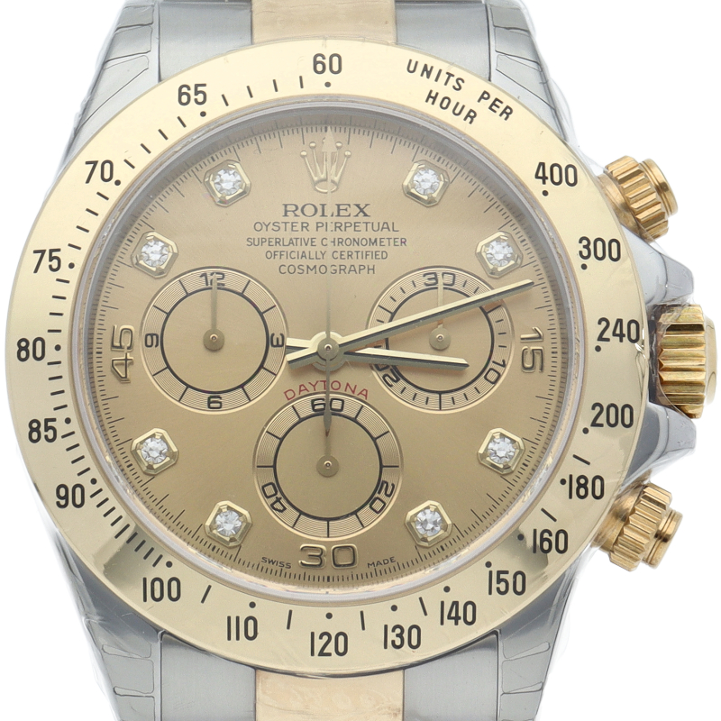 ロレックスのスポーツモデルの最高峰に君臨する「デイトナ」。自社開発クロノグラフムーブメント「Cal.4130」を搭載、機能性・デザイン性を兼ね備えた人気ウォッチ。イエローゴールドとステンレスのコンビ仕様に8Pダイヤが施されております。