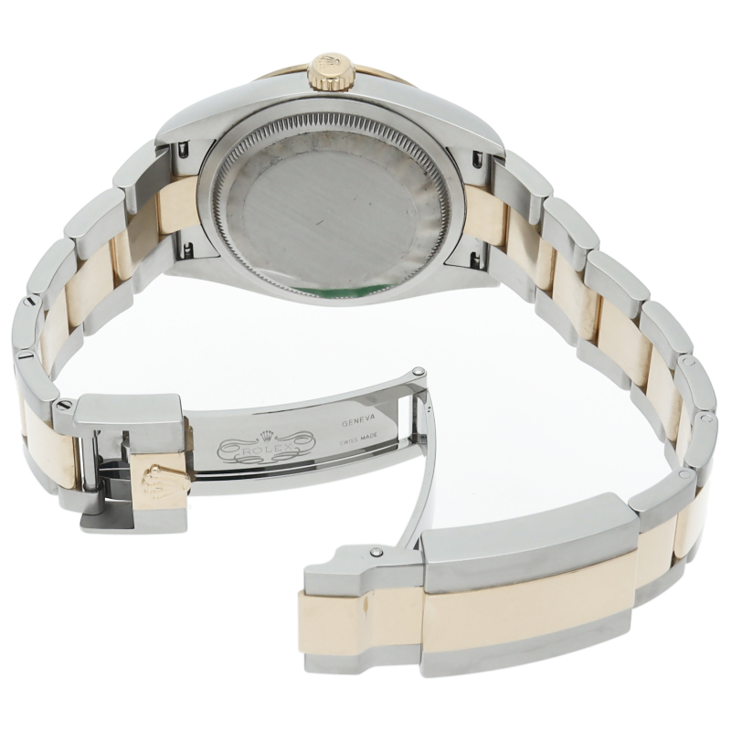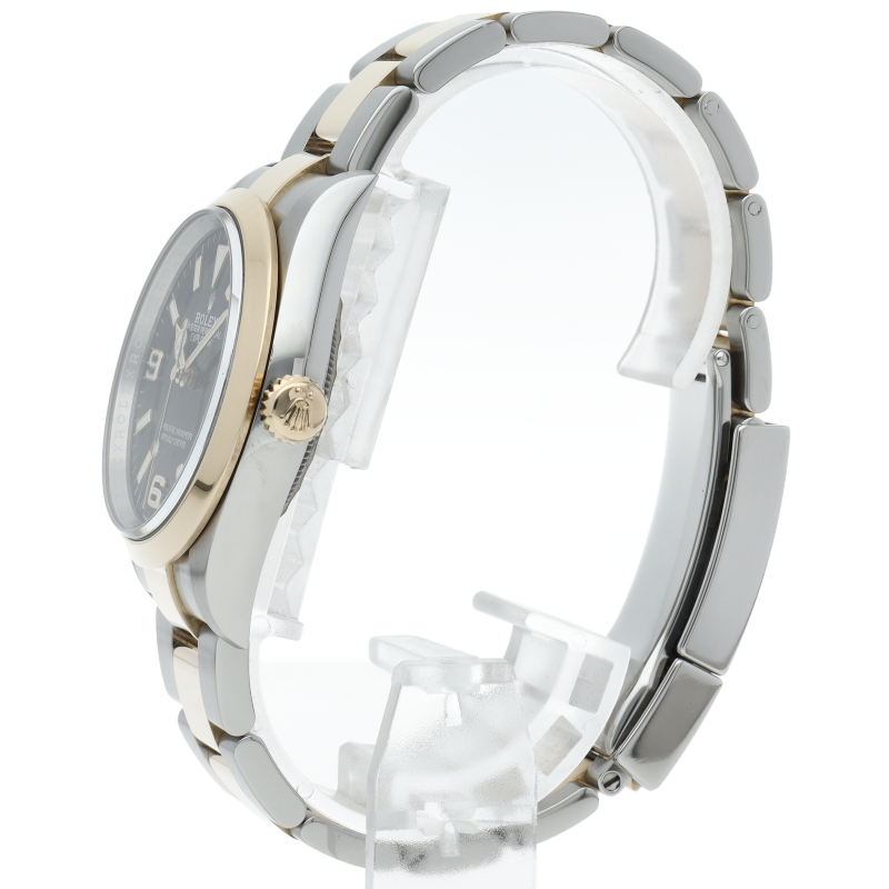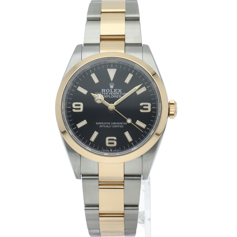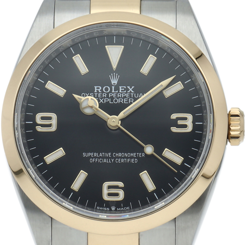 新たに加わったイエローゴールドとステンレスのコンビモデルのRef.124273も、124270と同様に36mmケースでの登場となりました。ムーブメントには、高いエネルギー効率と信頼性を両立させるロレックス特許のクロナジーエスケープメントを採用し、シリコン製ヘアスプリングと高性能パラフレックスショックアブソーバを装備した70時間パワーリザーブのキャリバー3230を搭載。