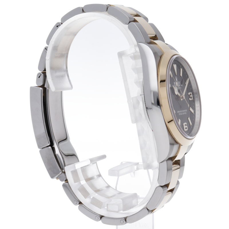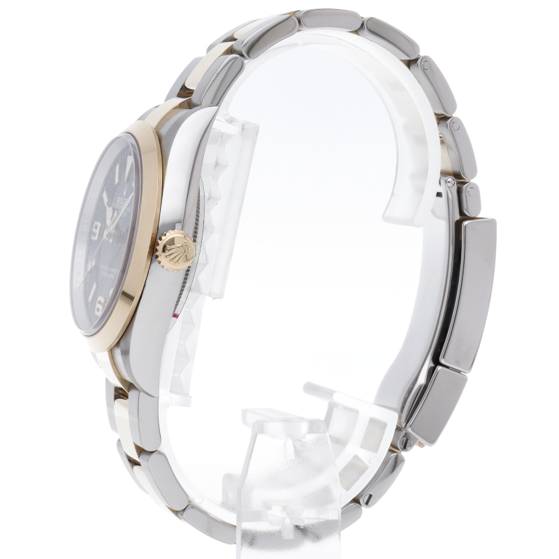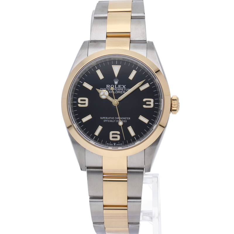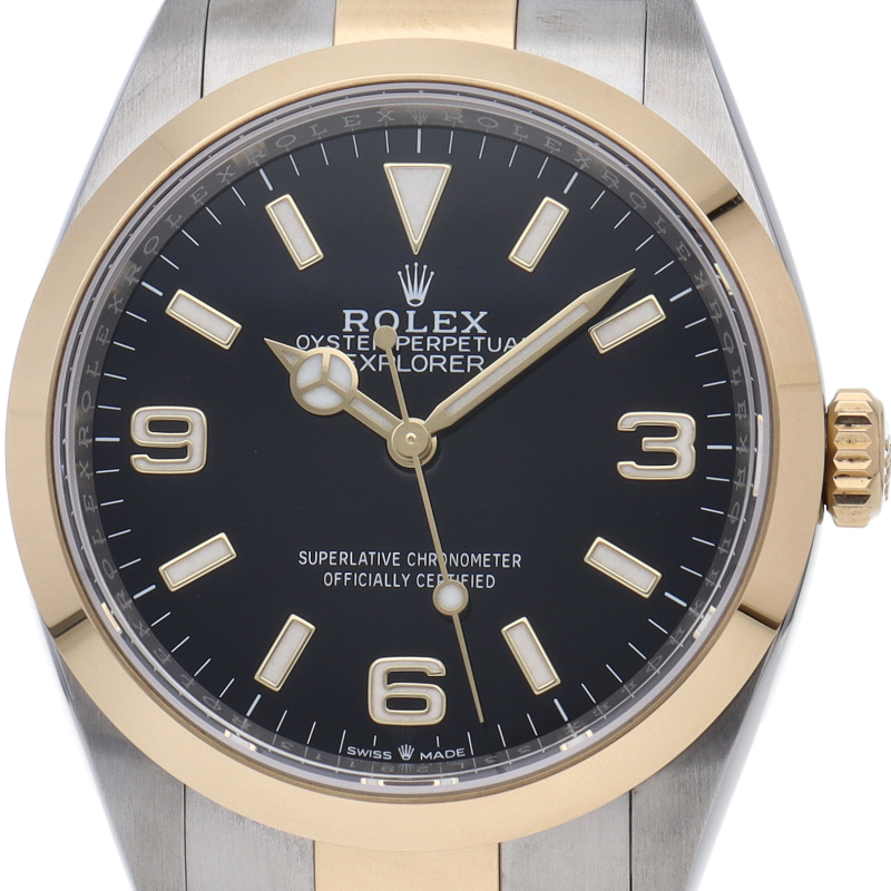 新たに加わったイエローゴールドとステンレスのコンビモデルのRef.124273も、124270と同様に36mmケースでの登場となりました。ムーブメントには、高いエネルギー効率と信頼性を両立させるロレックス特許のクロナジーエスケープメントを採用し、シリコン製ヘアスプリングと高性能パラフレックスショックアブソーバを装備した70時間パワーリザーブのキャリバー3230を搭載。