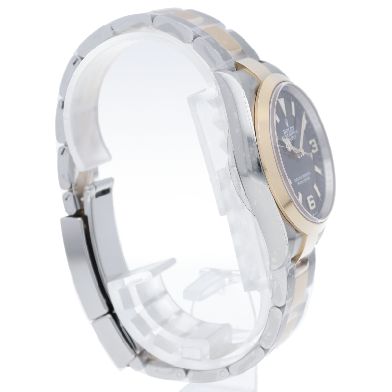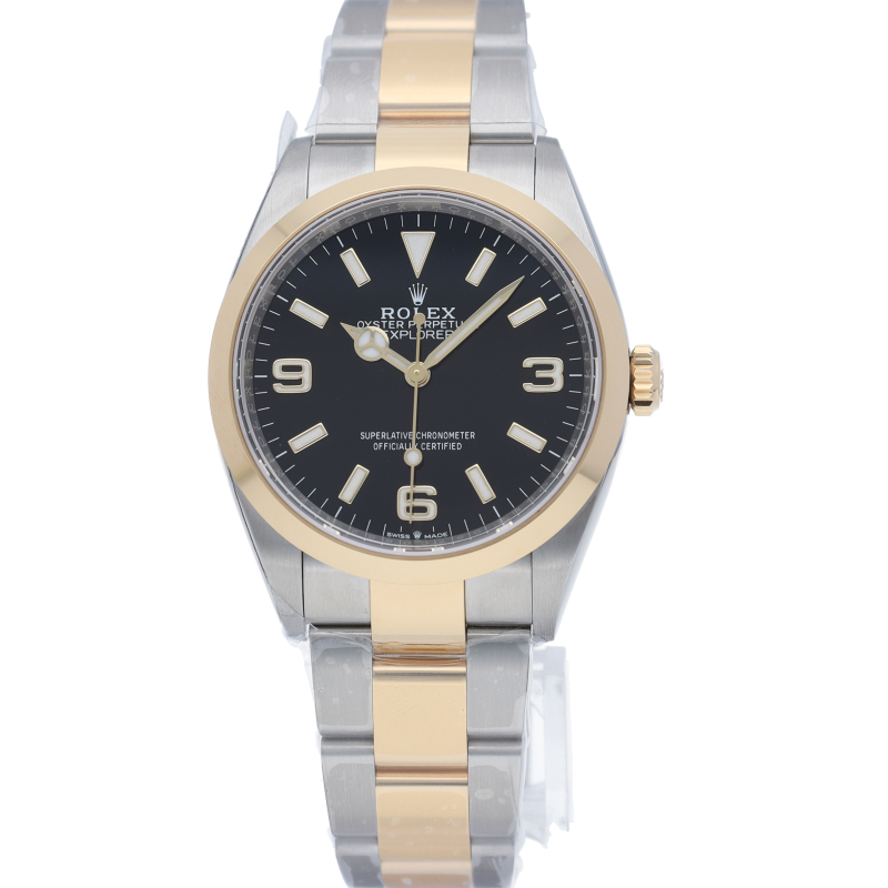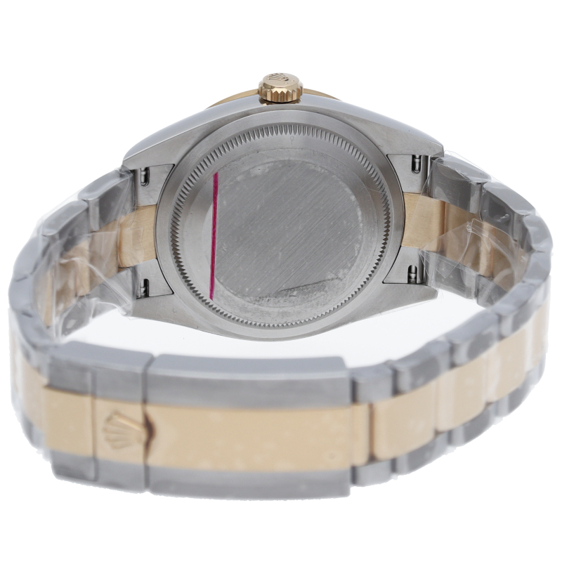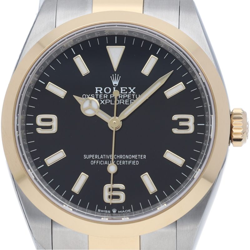 新たに加わったイエローゴールドとステンレスのコンビモデルのRef.124273も、124270と同様に36mmケースでの登場となりました。ムーブメントには、高いエネルギー効率と信頼性を両立させるロレックス特許のクロナジーエスケープメントを採用し、シリコン製ヘアスプリングと高性能パラフレックスショックアブソーバを装備した70時間パワーリザーブのキャリバー3230を搭載。