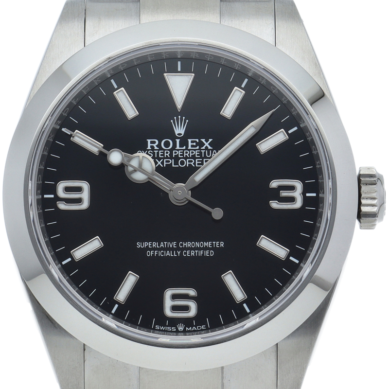 1953年に誕生した冒険家の為の時計、オイスターパーペチュアル エクスプローラー40。ムーブメントには、高いエネルギー効率と信頼性を両立させるロレックス特許のクロナジーエスケープメントを採用し、シリコン製ヘアスプリングと高性能パラフレックスショックアブソーバを装備した70時間パワーリザーブのキャリバー3230を搭載しています。2023年登場の新型モデル。
