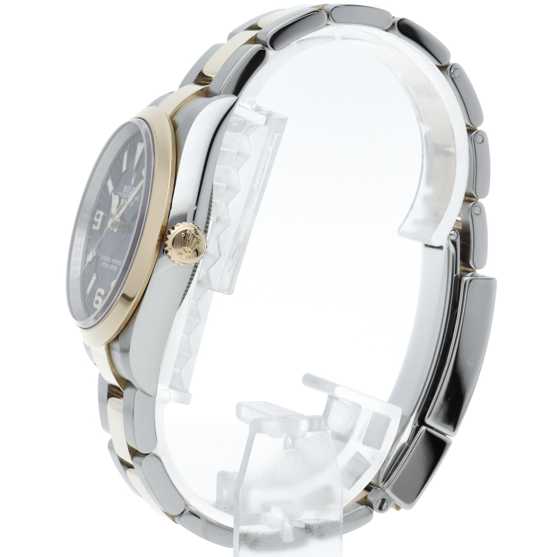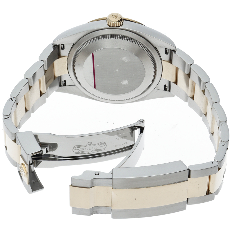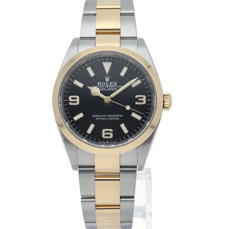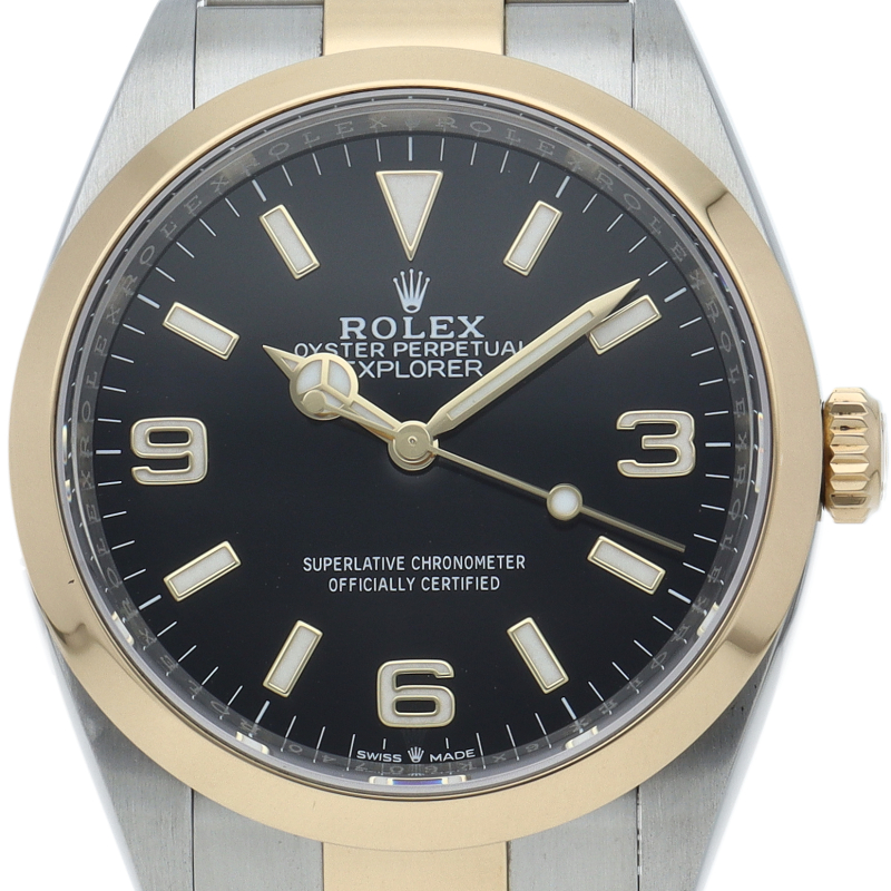 新たに加わったイエローゴールドとステンレスのコンビモデルのRef.124273も、124270と同様に36mmケースでの登場となりました。ムーブメントには、高いエネルギー効率と信頼性を両立させるロレックス特許のクロナジーエスケープメントを採用し、シリコン製ヘアスプリングと高性能パラフレックスショックアブソーバを装備した70時間パワーリザーブのキャリバー3230を搭載。