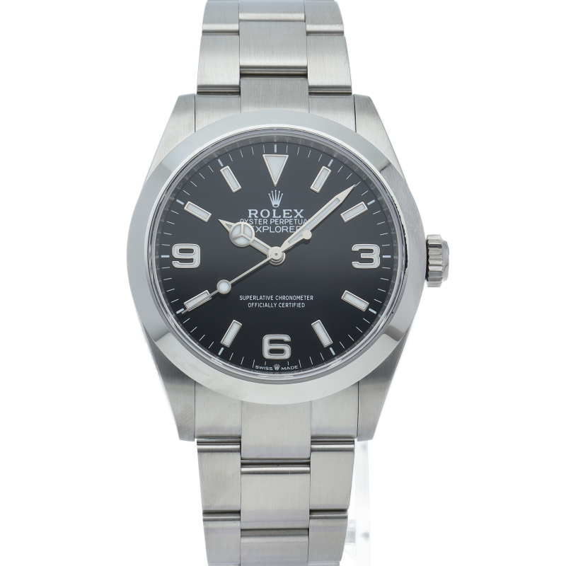1953年に誕生した冒険家の為の時計、オイスターパーペチュアル エクスプローラー40。ムーブメントには、高いエネルギー効率と信頼性を両立させるロレックス特許のクロナジーエスケープメントを採用し、シリコン製ヘアスプリングと高性能パラフレックスショックアブソーバを装備した70時間パワーリザーブのキャリバー3230を搭載しています。2023年登場の新型モデル。