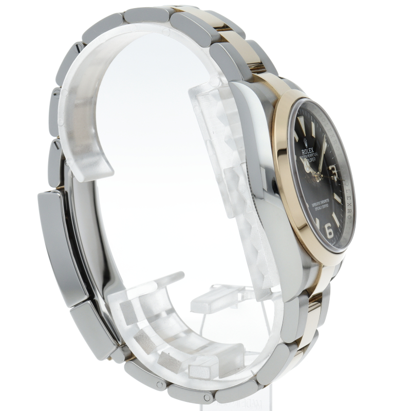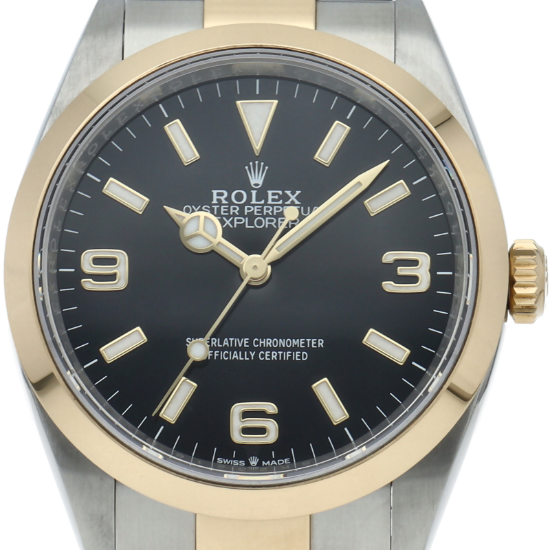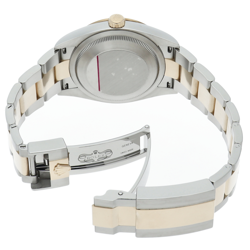 新たに加わったイエローゴールドとステンレスのコンビモデルのRef.124273も、124270と同様に36mmケースでの登場となりました。ムーブメントには、高いエネルギー効率と信頼性を両立させるロレックス特許のクロナジーエスケープメントを採用し、シリコン製ヘアスプリングと高性能パラフレックスショックアブソーバを装備した70時間パワーリザーブのキャリバー3230を搭載。