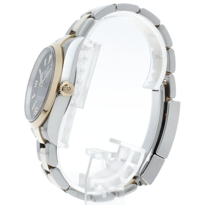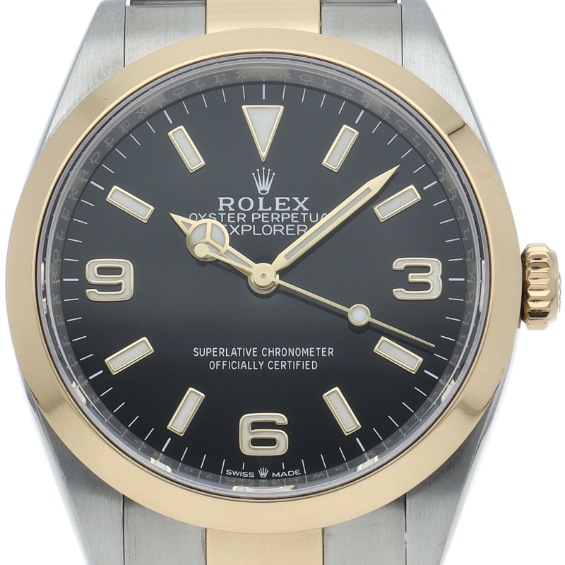新たに加わったイエローゴールドとステンレスのコンビモデルのRef.124273も、124270と同様に36mmケースでの登場となりました。ムーブメントには、高いエネルギー効率と信頼性を両立させるロレックス特許のクロナジーエスケープメントを採用し、シリコン製ヘアスプリングと高性能パラフレックスショックアブソーバを装備した70時間パワーリザーブのキャリバー3230を搭載。