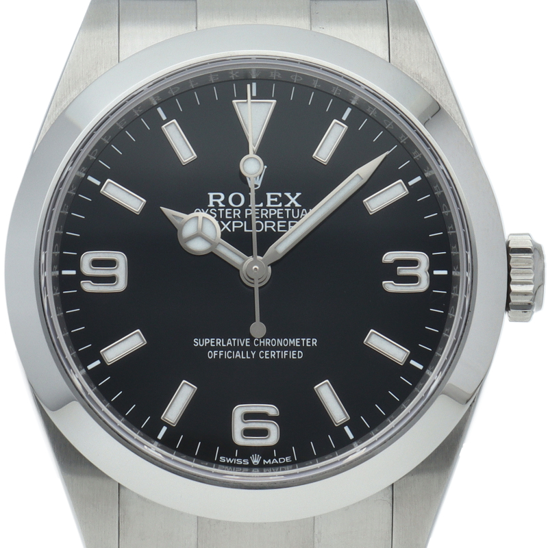 1953年に誕生した冒険家の為の時計、オイスターパーペチュアル エクスプローラー40。ムーブメントには、高いエネルギー効率と信頼性を両立させるロレックス特許のクロナジーエスケープメントを採用し、シリコン製ヘアスプリングと高性能パラフレックスショックアブソーバを装備した70時間パワーリザーブのキャリバー3230を搭載しています。2023年登場の新型モデル。