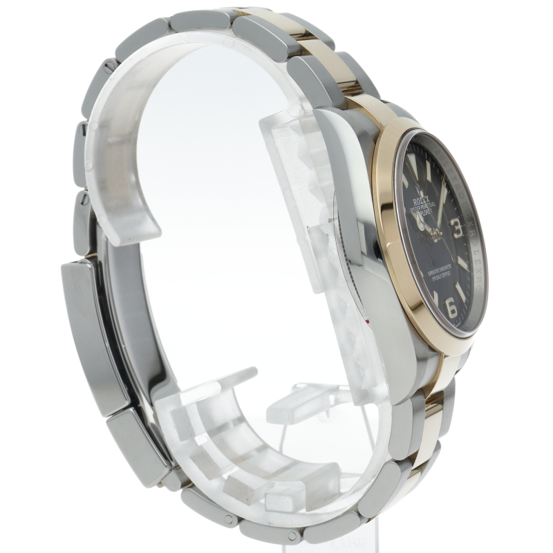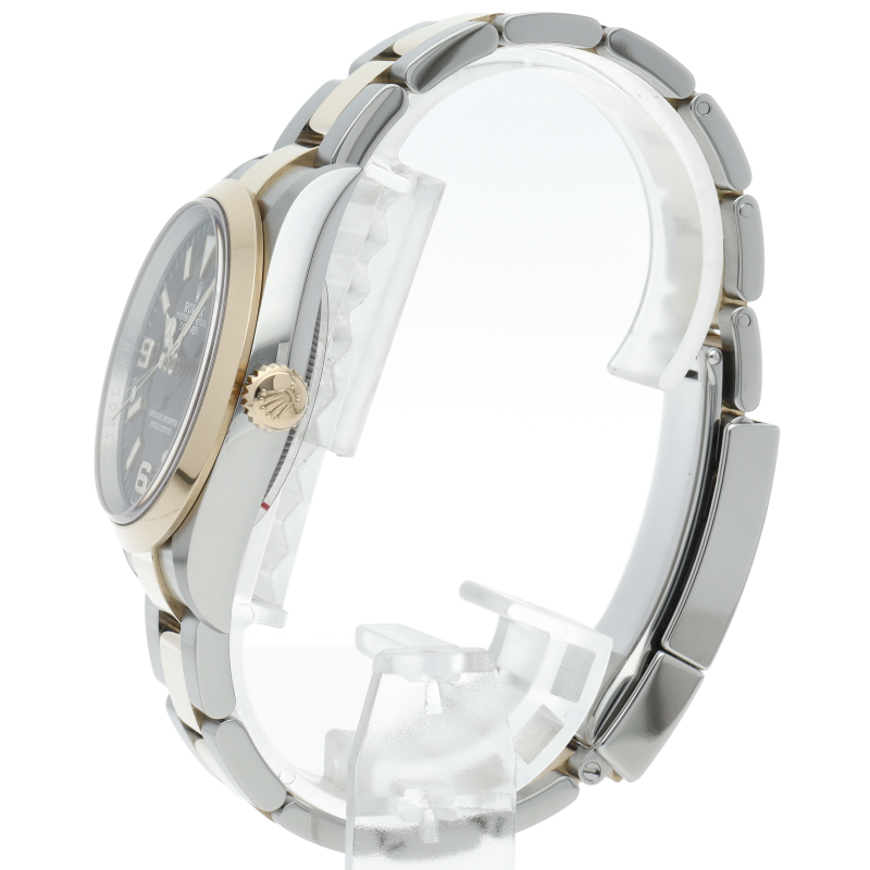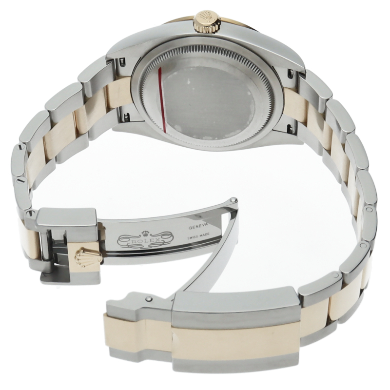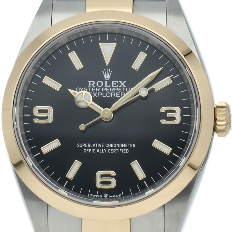 新たに加わったイエローゴールドとステンレスのコンビモデルのRef.124273も、124270と同様に36mmケースでの登場となりました。ムーブメントには、高いエネルギー効率と信頼性を両立させるロレックス特許のクロナジーエスケープメントを採用し、シリコン製ヘアスプリングと高性能パラフレックスショックアブソーバを装備した70時間パワーリザーブのキャリバー3230を搭載。