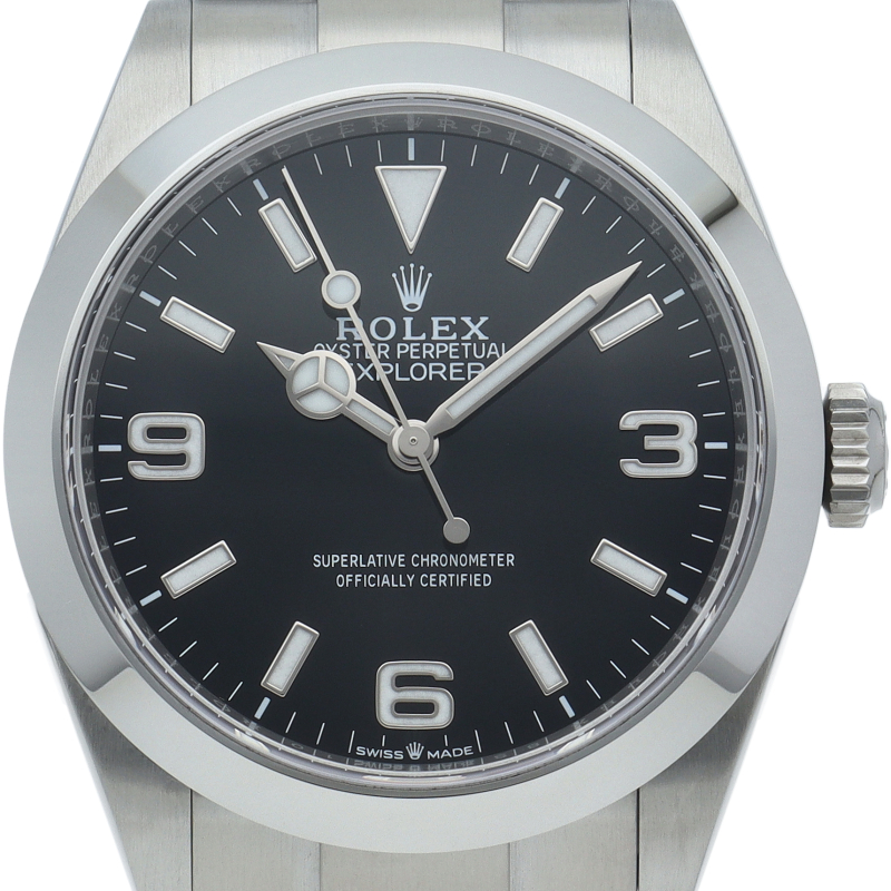 1953年に誕生した冒険家の為の時計、オイスターパーペチュアル エクスプローラー40。ムーブメントには、高いエネルギー効率と信頼性を両立させるロレックス特許のクロナジーエスケープメントを採用し、シリコン製ヘアスプリングと高性能パラフレックスショックアブソーバを装備した70時間パワーリザーブのキャリバー3230を搭載しています。2023年登場の新型モデル。
