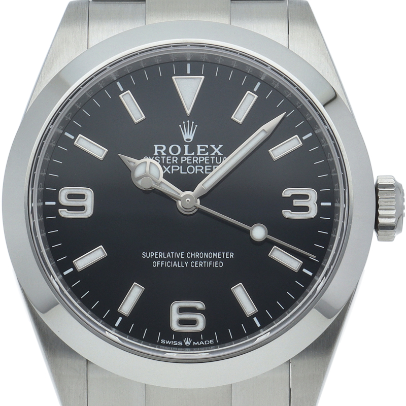 1953年に誕生した冒険家の為の時計、オイスターパーペチュアル エクスプローラー40。ムーブメントには、高いエネルギー効率と信頼性を両立させるロレックス特許のクロナジーエスケープメントを採用し、シリコン製ヘアスプリングと高性能パラフレックスショックアブソーバを装備した70時間パワーリザーブのキャリバー3230を搭載しています。2023年登場の新型モデル。