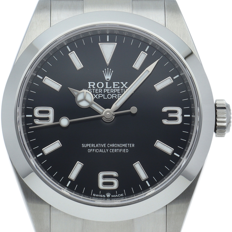 1953年に誕生した冒険家の為の時計、オイスターパーペチュアル エクスプローラー40。ムーブメントには、高いエネルギー効率と信頼性を両立させるロレックス特許のクロナジーエスケープメントを採用し、シリコン製ヘアスプリングと高性能パラフレックスショックアブソーバを装備した70時間パワーリザーブのキャリバー3230を搭載しています。2023年登場の新型モデル。