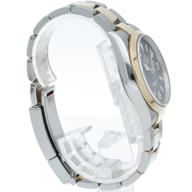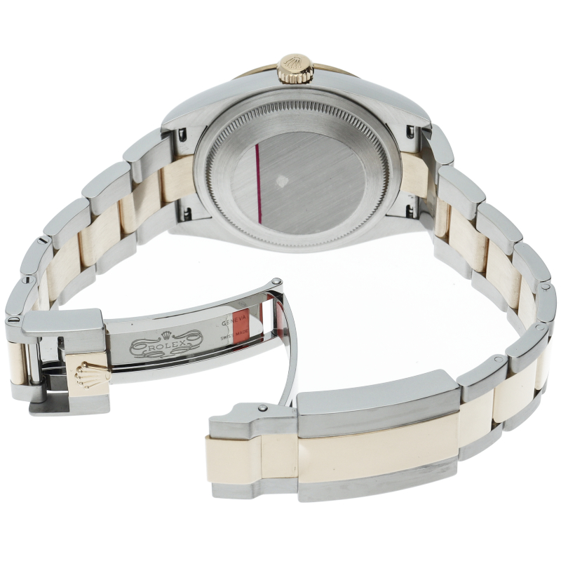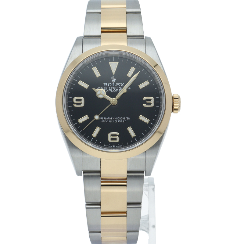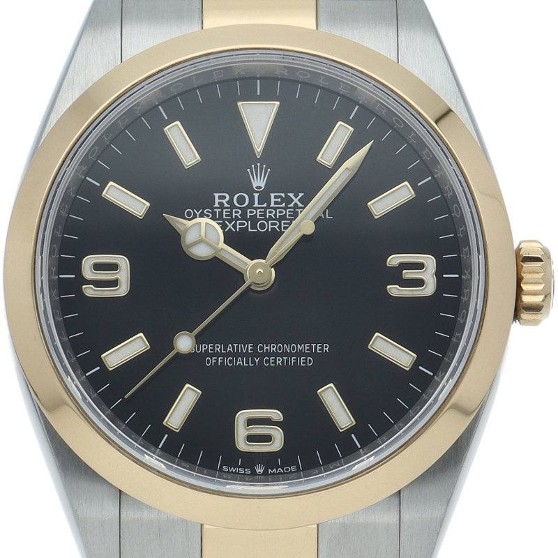 新たに加わったイエローゴールドとステンレスのコンビモデルのRef.124273も、124270と同様に36mmケースでの登場となりました。ムーブメントには、高いエネルギー効率と信頼性を両立させるロレックス特許のクロナジーエスケープメントを採用し、シリコン製ヘアスプリングと高性能パラフレックスショックアブソーバを装備した70時間パワーリザーブのキャリバー3230を搭載。