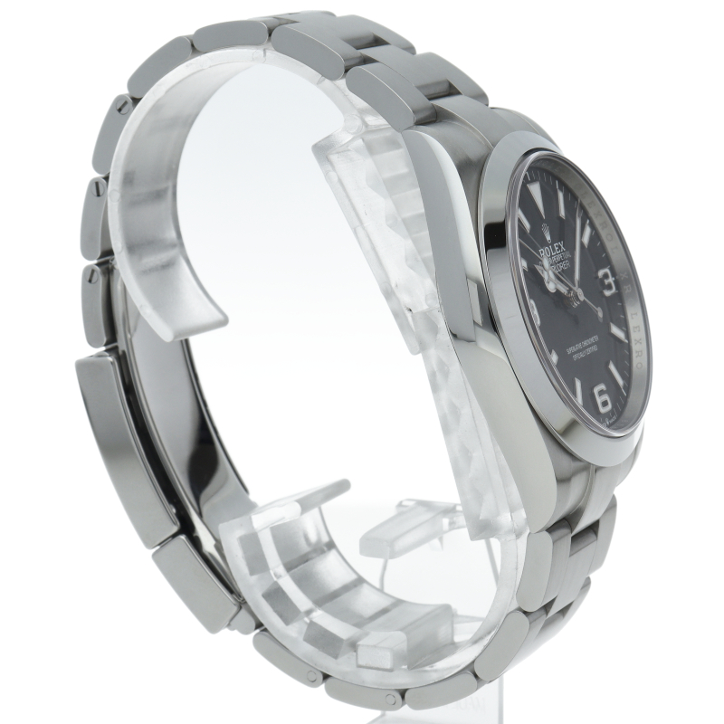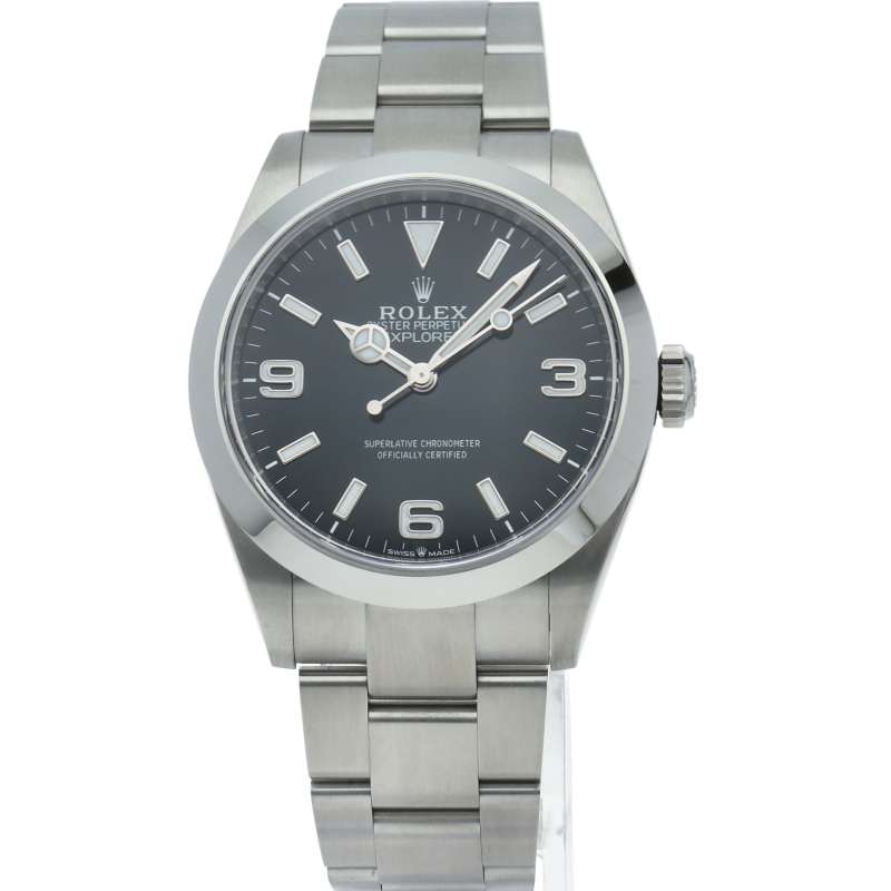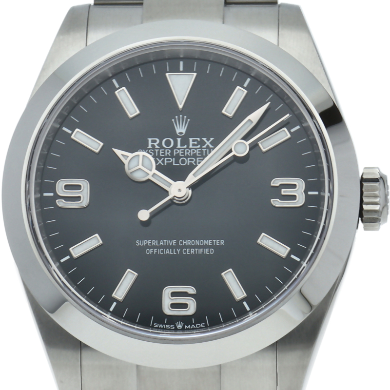 1953年に誕生した冒険家の為の時計、オイスターパーペチュアル エクスプローラー40。ムーブメントには、高いエネルギー効率と信頼性を両立させるロレックス特許のクロナジーエスケープメントを採用し、シリコン製ヘアスプリングと高性能パラフレックスショックアブソーバを装備した70時間パワーリザーブのキャリバー3230を搭載しています。2023年登場の新型モデル。