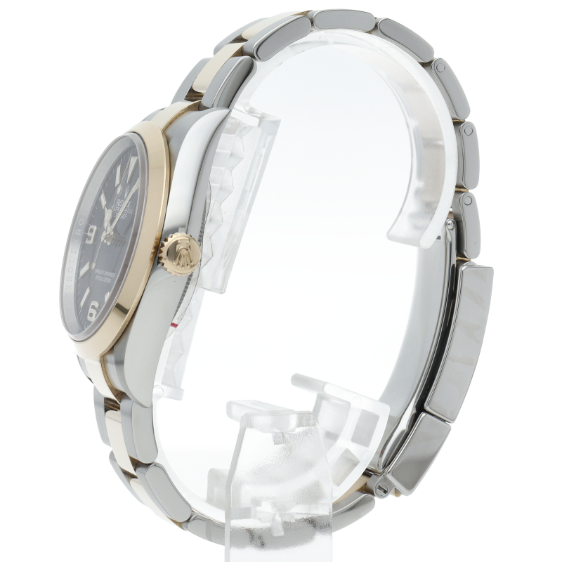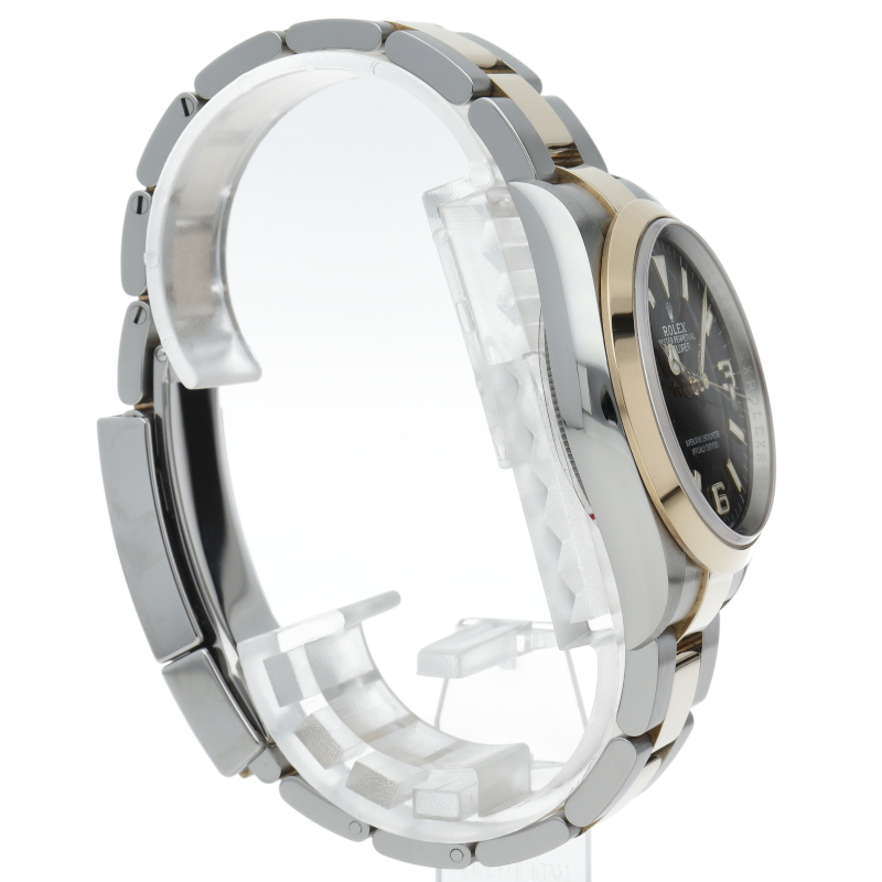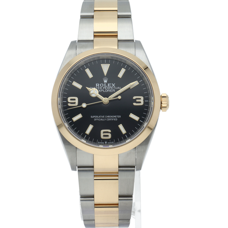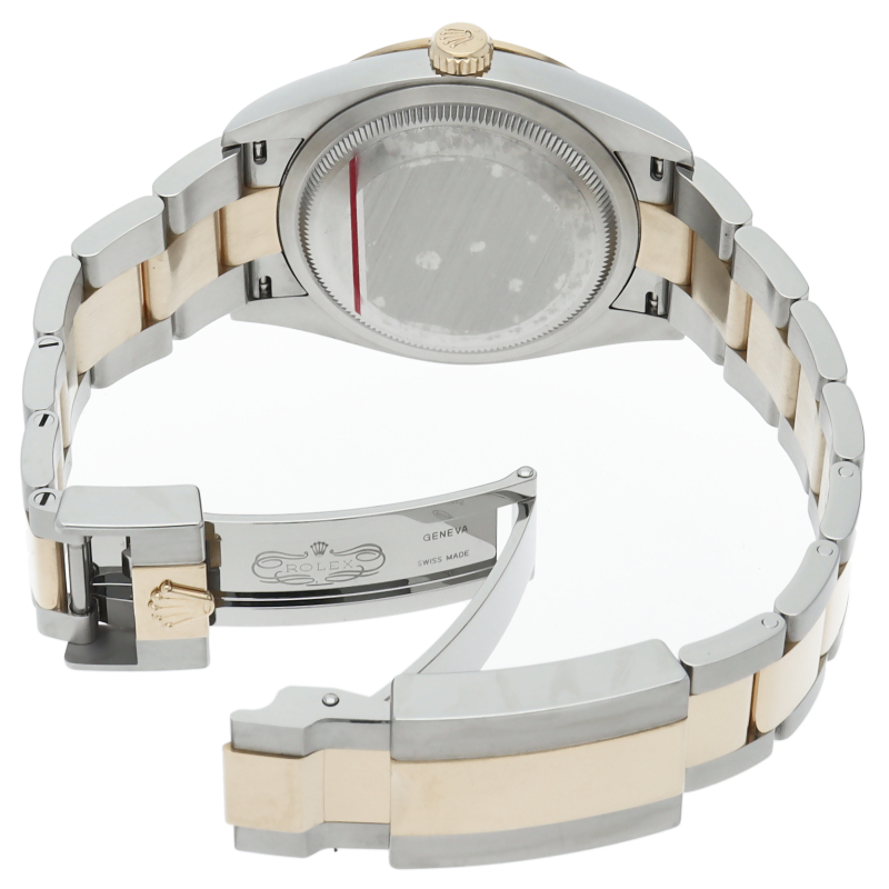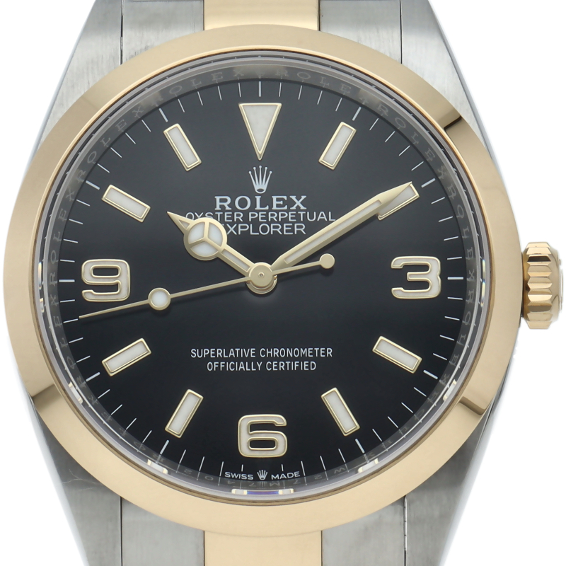 新たに加わったイエローゴールドとステンレスのコンビモデルのRef.124273も、124270と同様に36mmケースでの登場となりました。ムーブメントには、高いエネルギー効率と信頼性を両立させるロレックス特許のクロナジーエスケープメントを採用し、シリコン製ヘアスプリングと高性能パラフレックスショックアブソーバを装備した70時間パワーリザーブのキャリバー3230を搭載。