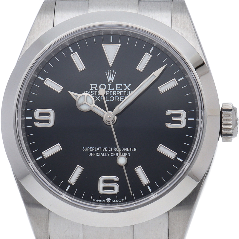 1953年に誕生した冒険家の為の時計、オイスターパーペチュアル エクスプローラー40。ムーブメントには、高いエネルギー効率と信頼性を両立させるロレックス特許のクロナジーエスケープメントを採用し、シリコン製ヘアスプリングと高性能パラフレックスショックアブソーバを装備した70時間パワーリザーブのキャリバー3230を搭載しています。2023年登場の新型モデル。