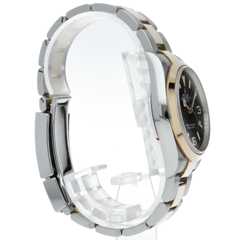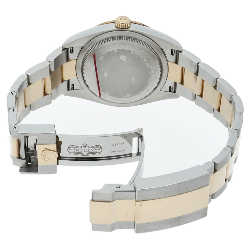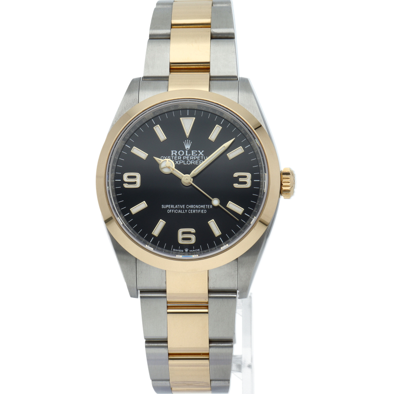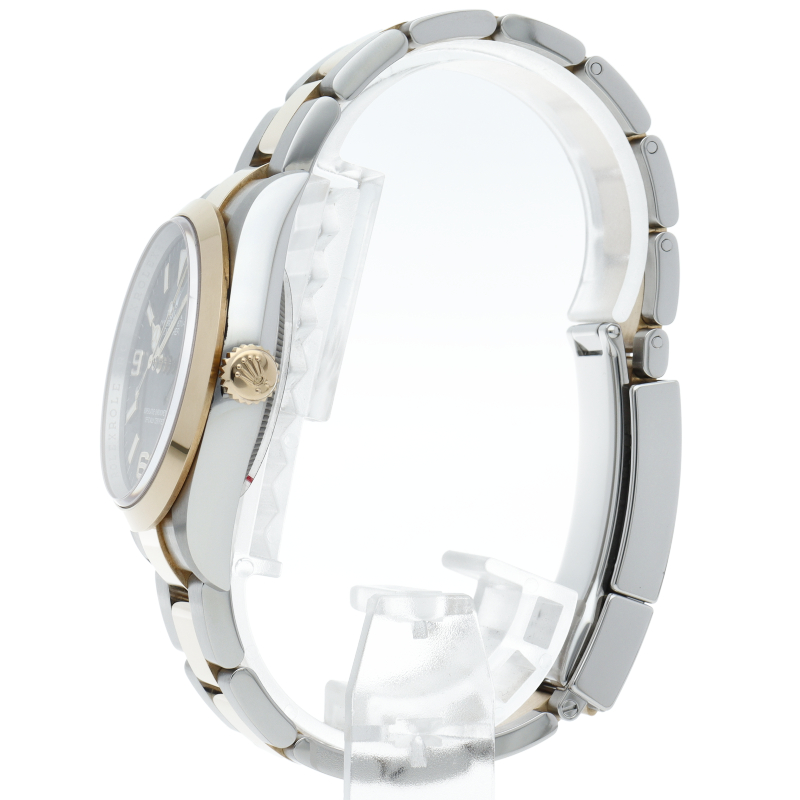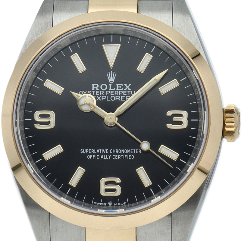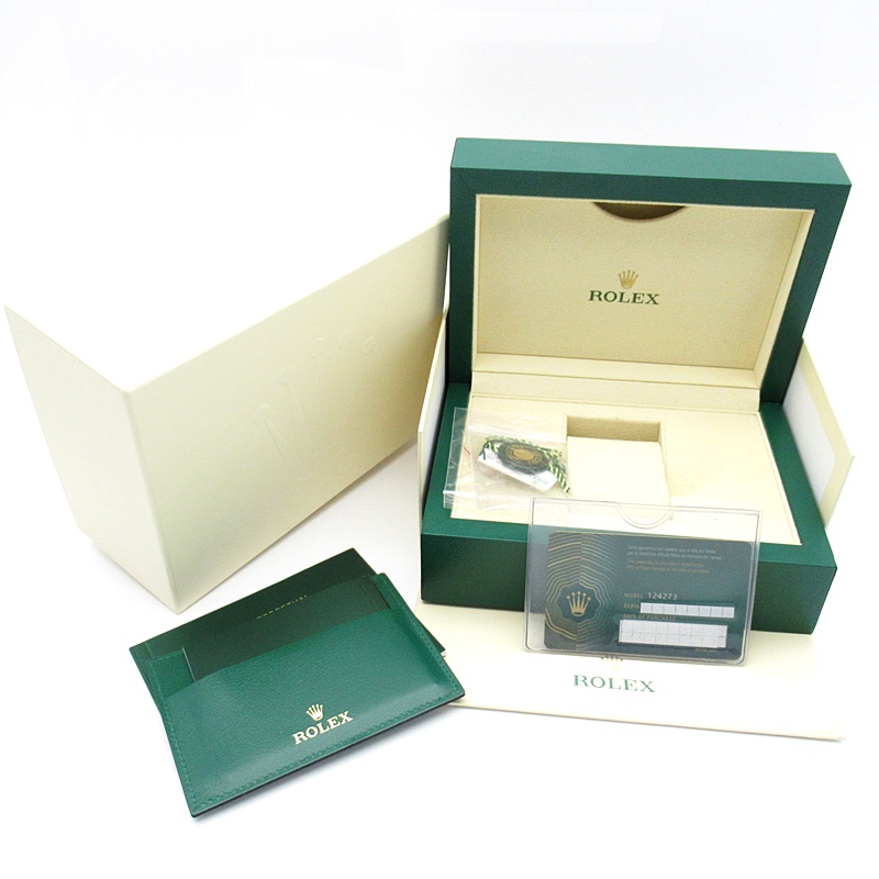 新たに加わったイエローゴールドとステンレスのコンビモデルのRef.124273も、124270と同様に36mmケースでの登場となりました。ムーブメントには、高いエネルギー効率と信頼性を両立させるロレックス特許のクロナジーエスケープメントを採用し、シリコン製ヘアスプリングと高性能パラフレックスショックアブソーバを装備した70時間パワーリザーブのキャリバー3230を搭載。