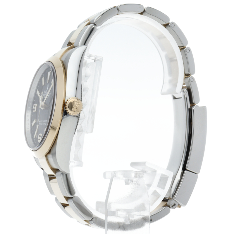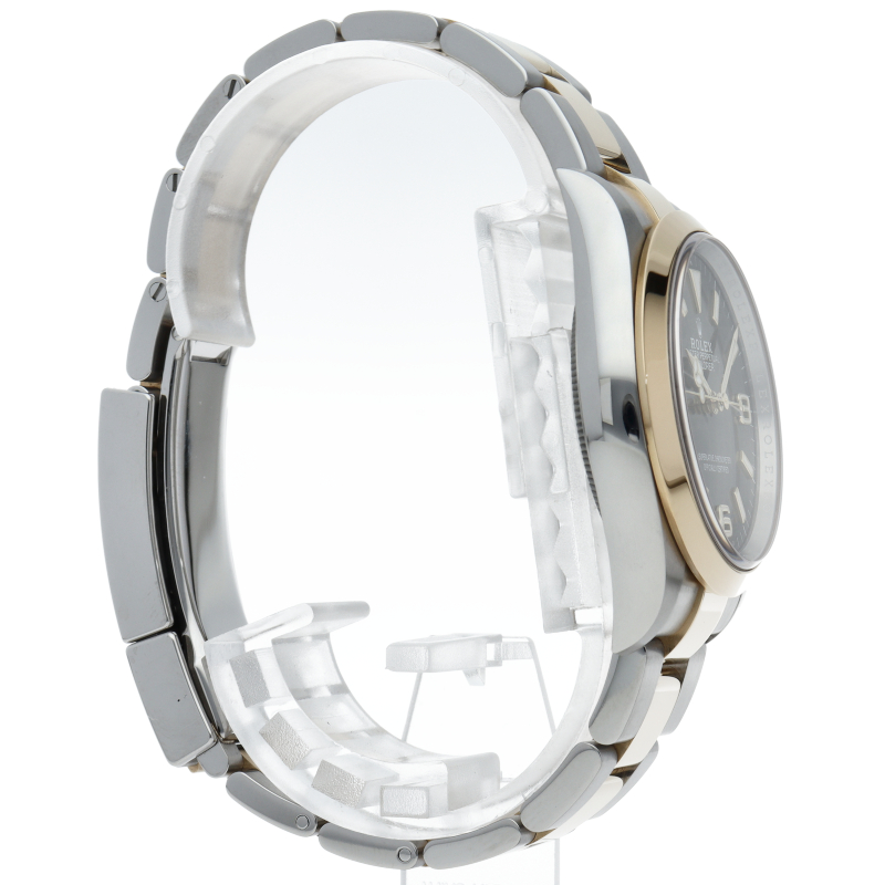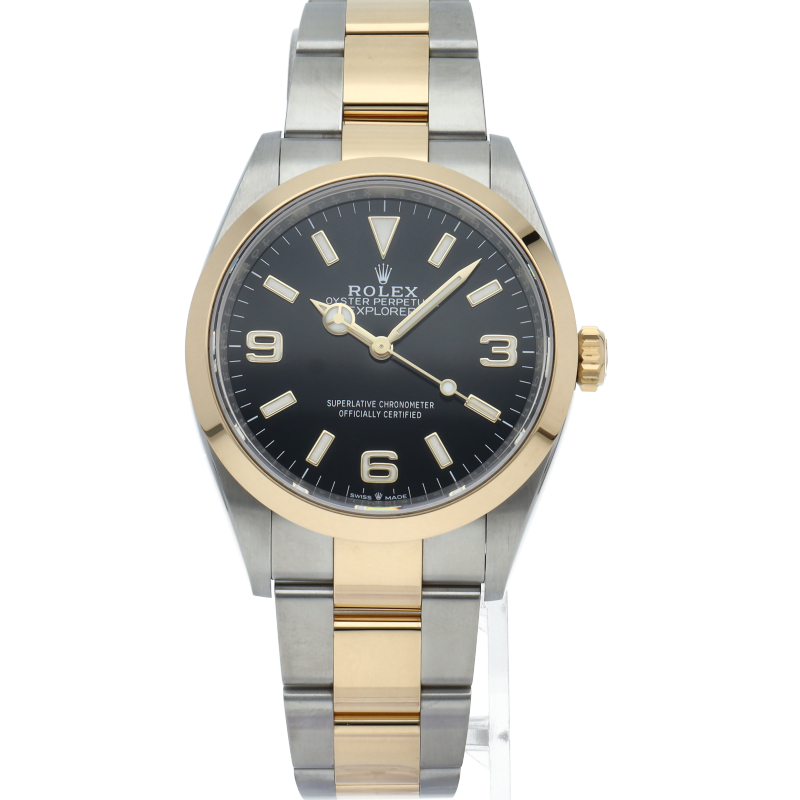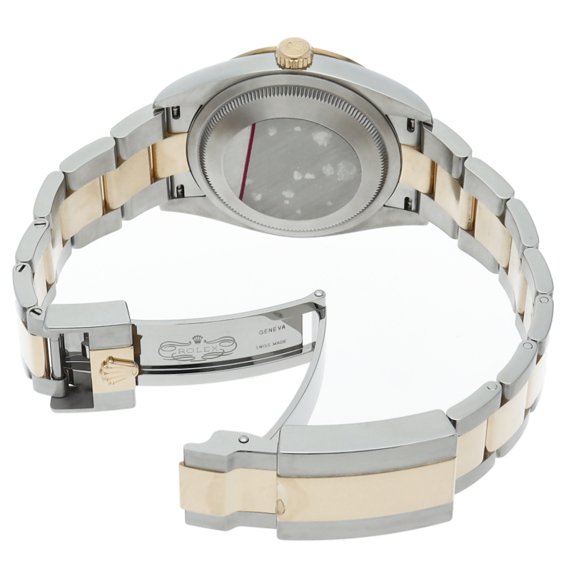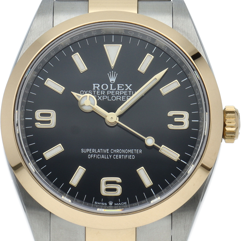 新たに加わったイエローゴールドとステンレスのコンビモデルのRef.124273も、124270と同様に36mmケースでの登場となりました。ムーブメントには、高いエネルギー効率と信頼性を両立させるロレックス特許のクロナジーエスケープメントを採用し、シリコン製ヘアスプリングと高性能パラフレックスショックアブソーバを装備した70時間パワーリザーブのキャリバー3230を搭載。