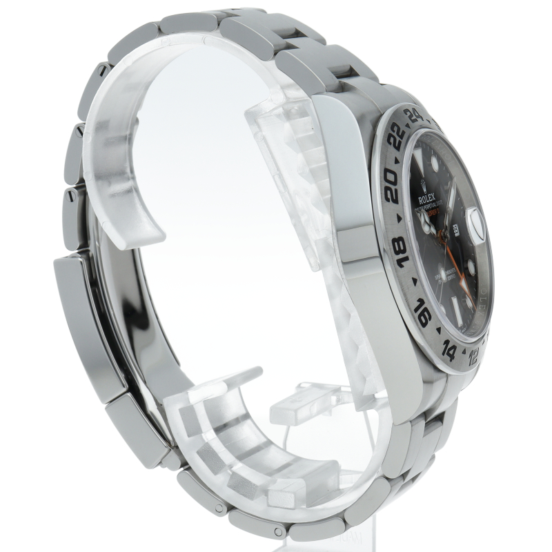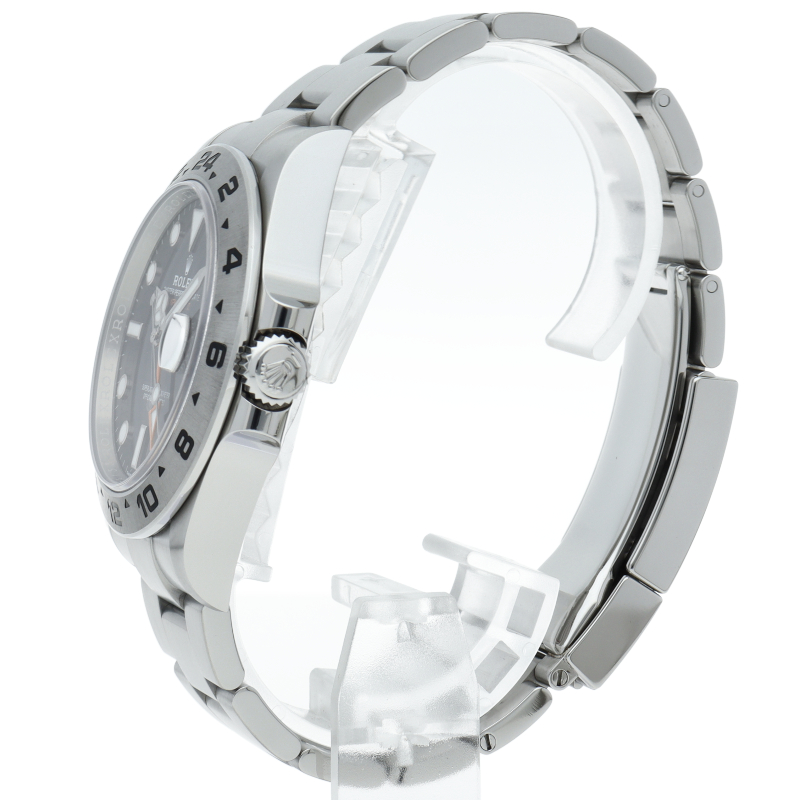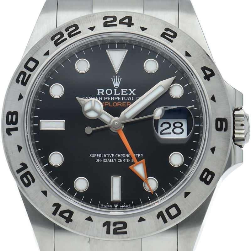 2021年に発表された216570の後継機、226570 オイスターパーペチュアル エクスプローラーII。文字盤中央から伸びるオレンジカラーのGMT針と24時間スケールが刻まれたベゼルを用いて第二時間帯も確認可能な探検家、登山家の為のプロフェッショナルウォッチです。